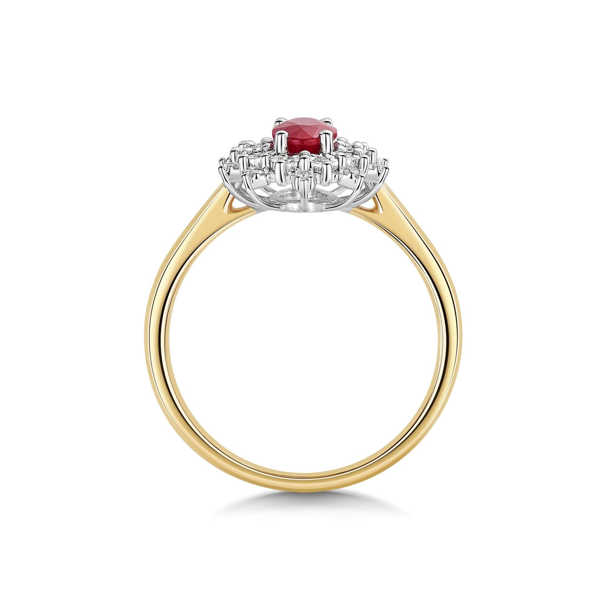 Presenting the exquisite 9ct Yellow Gold 0.66ct Oval Cut Ruby and Diamond Illusion Set Cluster Solitaire Ring from Chisholm Hunter. This stunning ring features a vibrant red oval-cut ruby, elegantly surrounded by sparkling diamonds, enhancing its allure and brilliance.