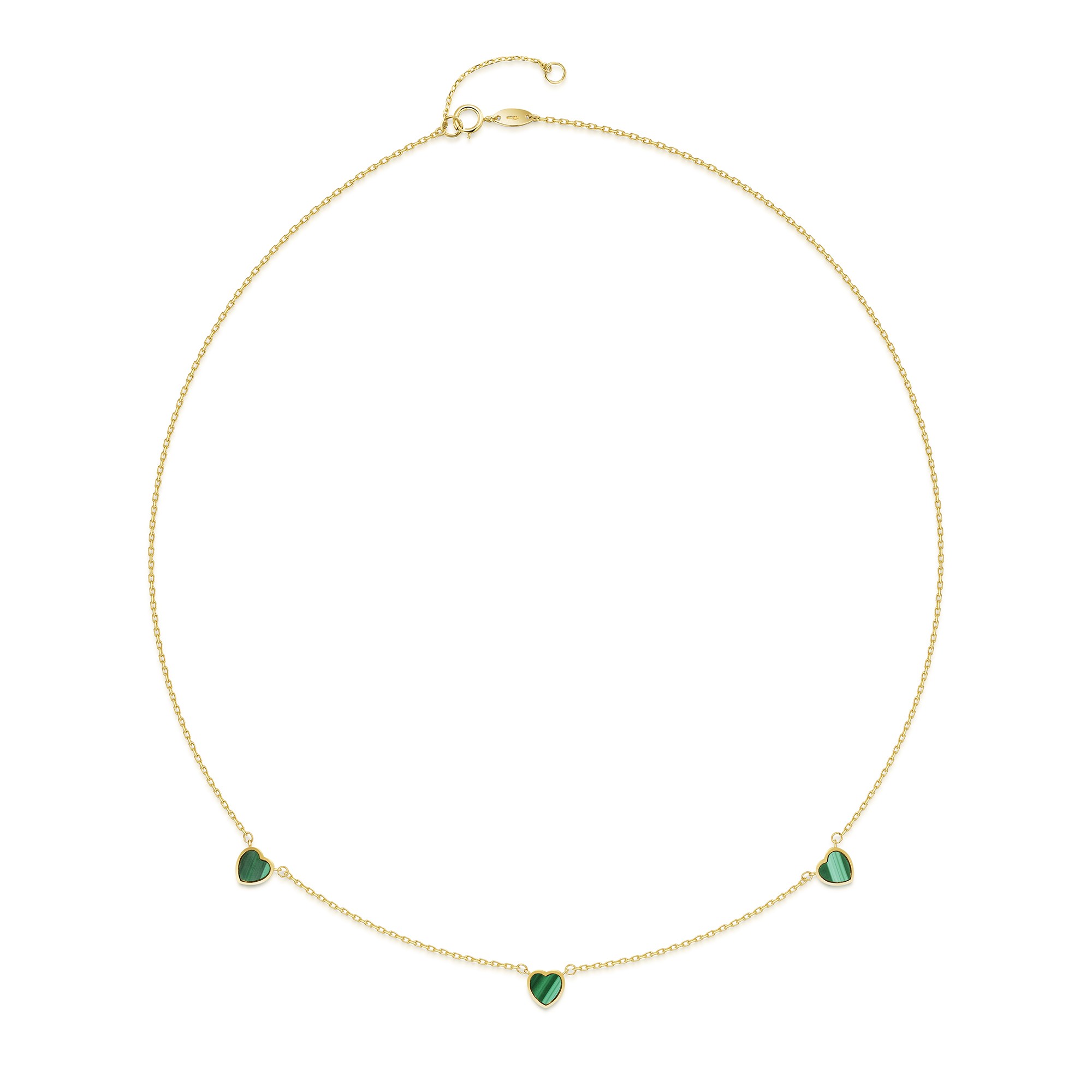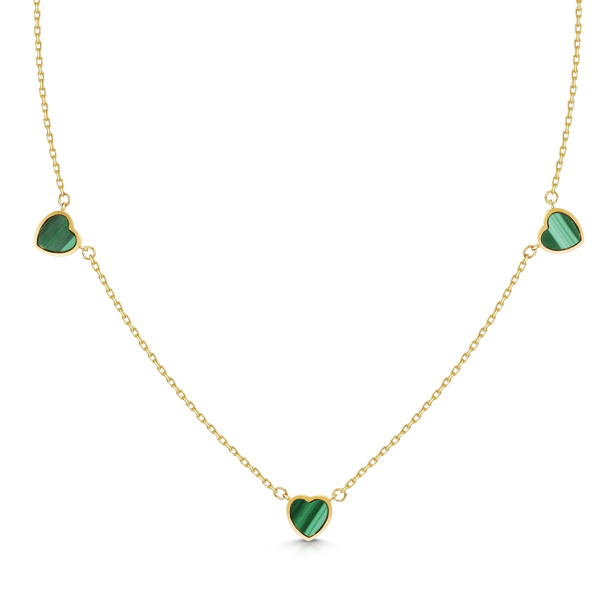 Introducing the exquisite 9ct Yellow Gold Malachite Heart Necklet, exclusively available at Chisholm Hunter. Crafted from luxurious 9ct yellow gold, the necklace transforms into a radiant canvas that accentuates the stunning green malachite hearts. The deep, rich hues green of the malachite gemstone capture the light perfectly to reveal the intricate banding unique to this captivating stone. Each heart cut of the malachite is chosen for its exceptional beauty, ensuring that your adornment is truly one-of-a-kind.