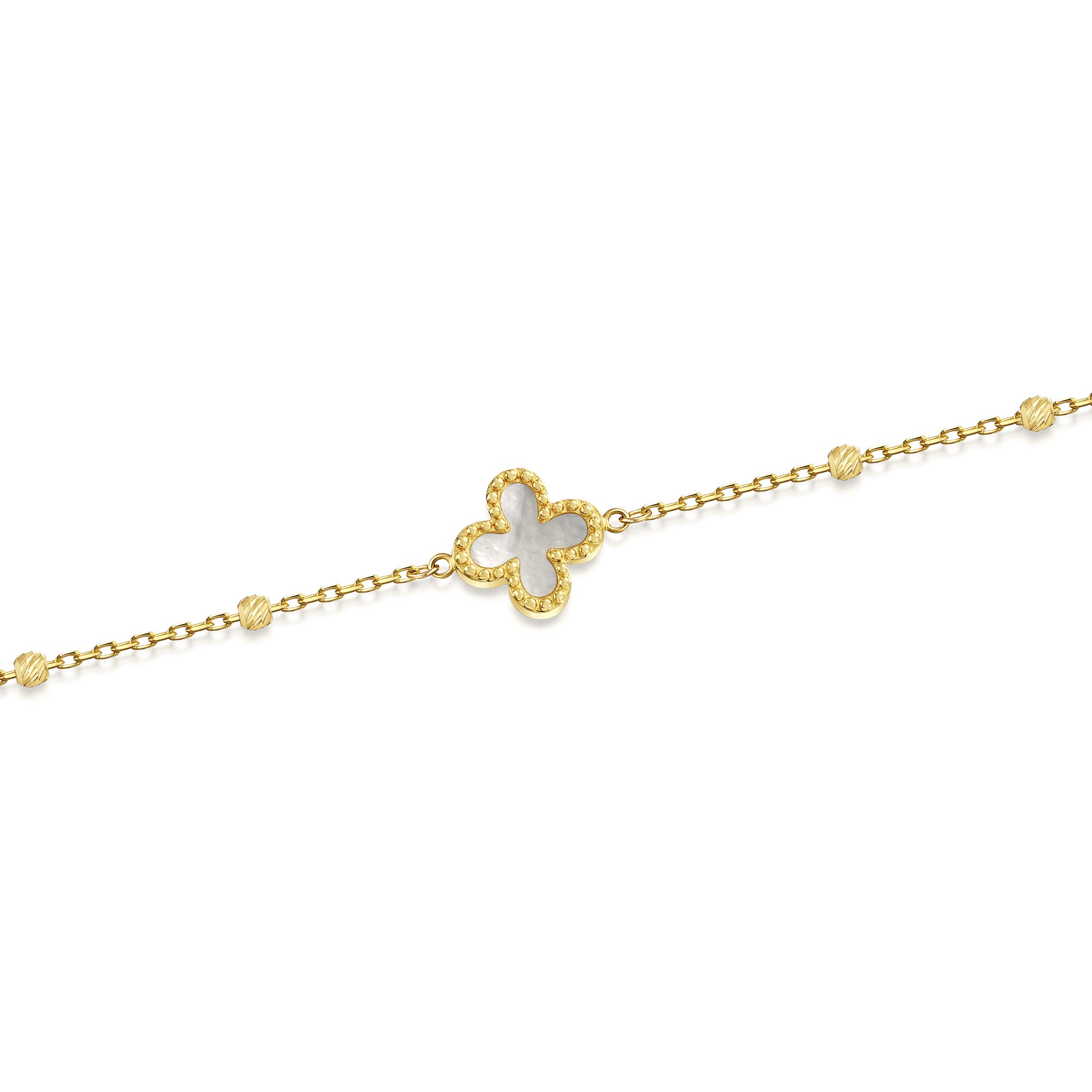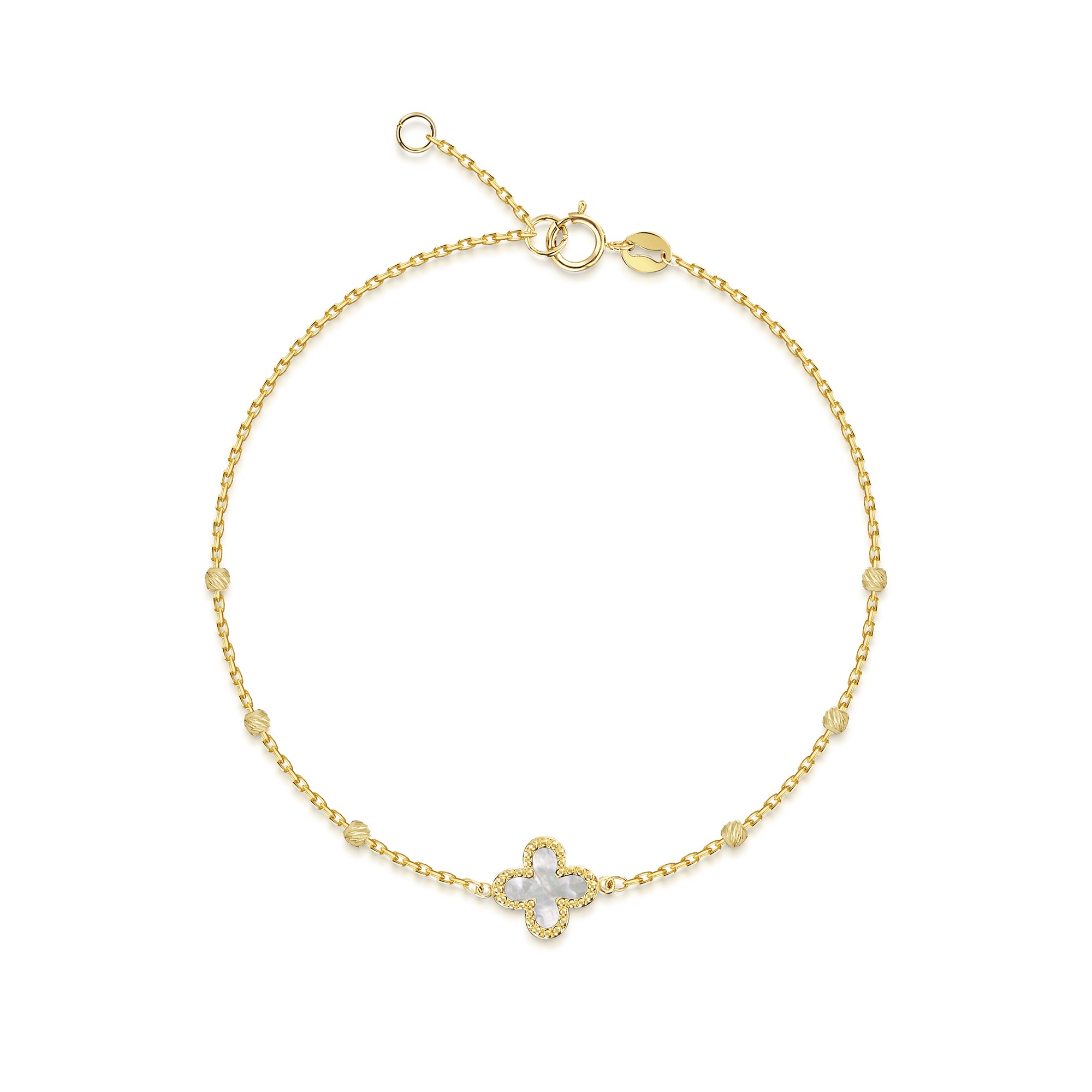 Designed for the discerning woman, this bracelet features radiant yellow gold that perfectly complements the understated beauty of the mother of pearl clover. The white mother of pearl gemstone glows with an iridescent hue, lending a subtle yet captivating sparkle to the piece.