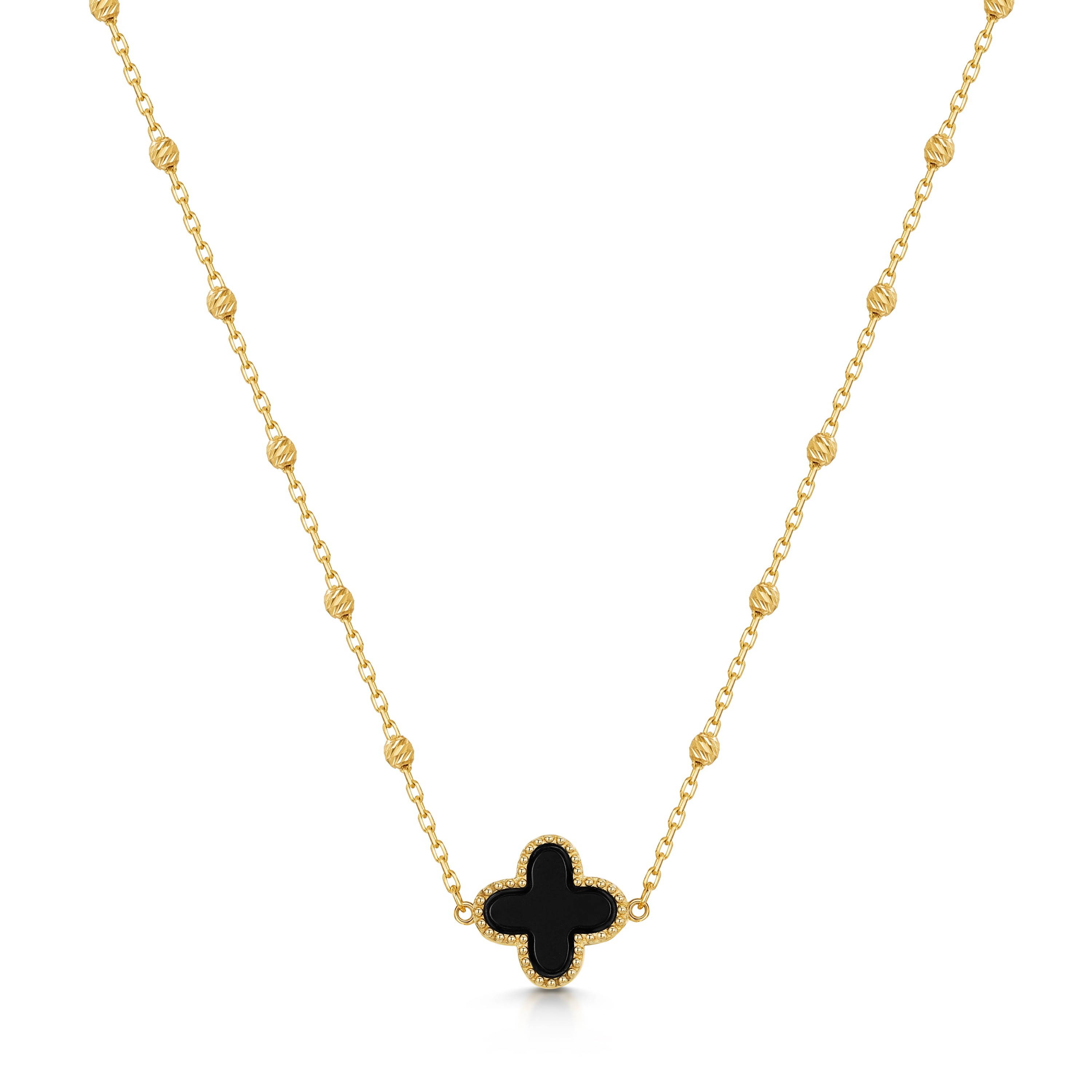 Cherish the beauty of the 9ct Yellow Gold Black Onyx Clover Necklet, an accessory that combines luxury and meaning in one stunning design.