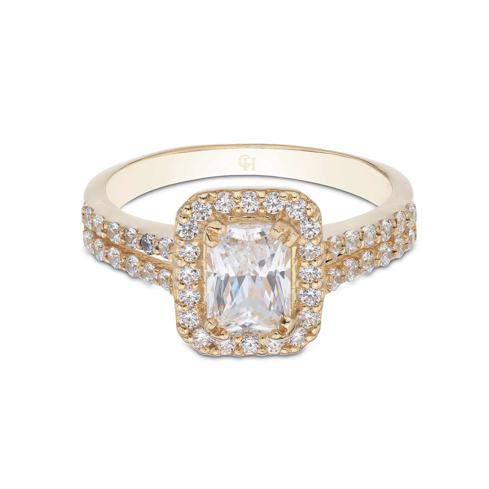Dress to impress with this feminine 9ct yellow gold cubic zirconia halo emerald cut double row shoulders solitaire ring. The perfect gift for yourself or loved one, this romantic ring is crafted from beautiful 9ct yellow gold and features a sparkling emerald cut zirconia surrounded by a dazzling halo and double row shoulders. Presented in Chisholm Hunter gift packaging.