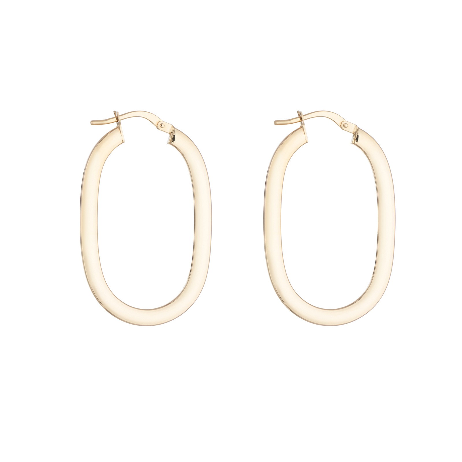 A unique twist on the classic hoop earring, these earrings are an oval shape and crafted in 9ct yellow gold. They are light and comfortable but still thick enough to be durable. The hinged pin makes the earrings very easy to put on and remove.