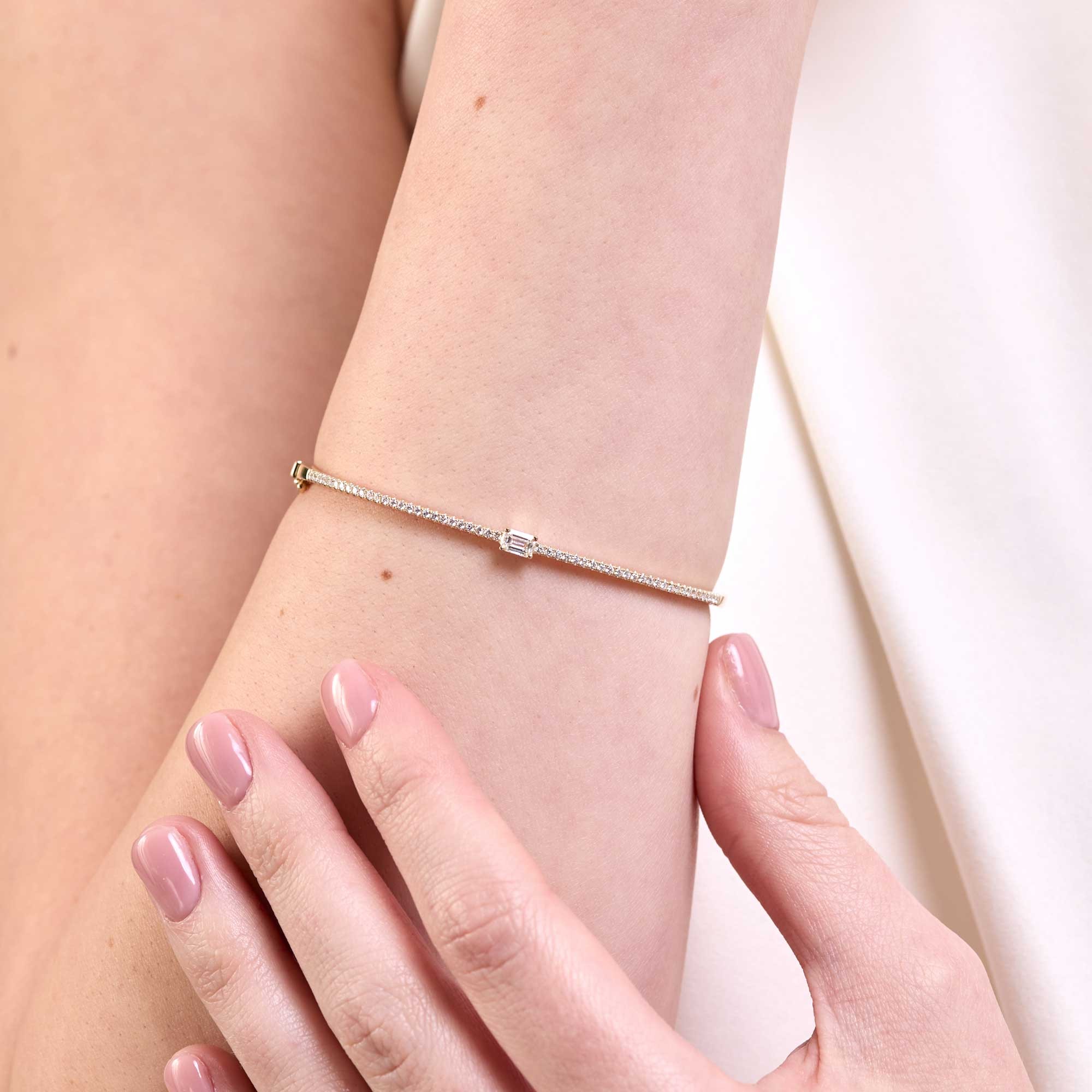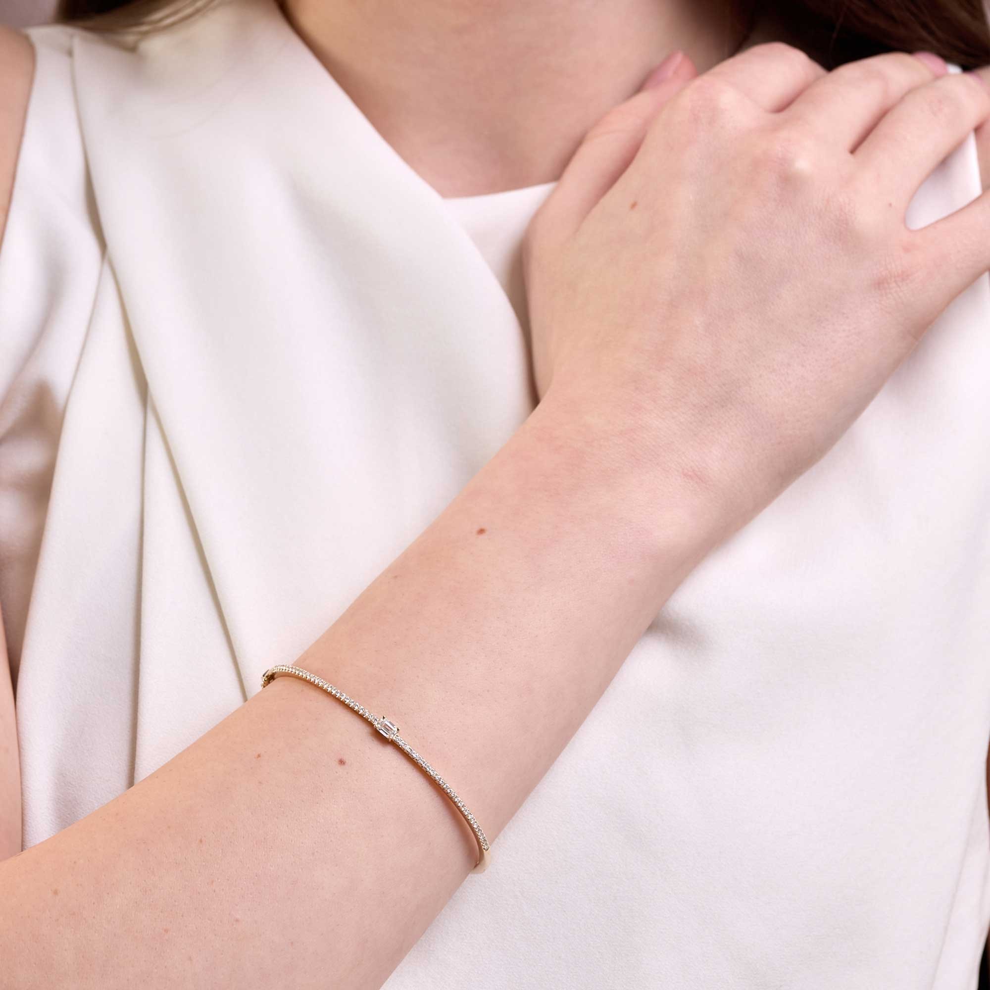 A considered choice for birthdays, anniversaries and milestones. This 9ct Yellow Gold Emerald Cut 0.60ct Diamond Bangle reflects light with every move yet keeps a sleek feel for everyday wear. Pair it with yellow gold hoops or a simple chain for a cohesive look.