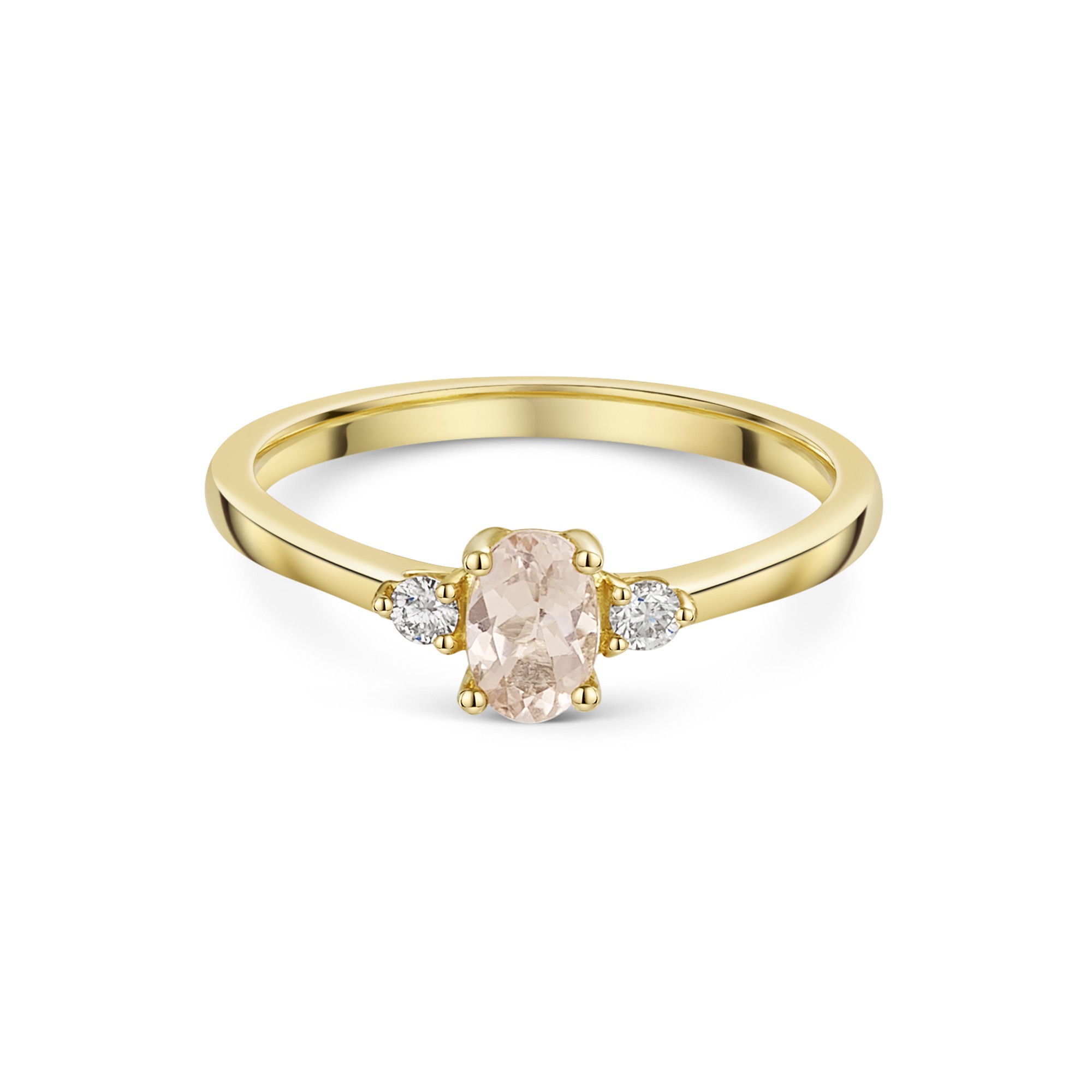 Flanking the morganite are two dazzling diamonds, each meticulously selected for their exceptional clarity and colour grading. With a total carat weight of 0.08ct, these diamonds add an enviable sparkle, ensuring this ring captures attention from every angle. The diamonds are carefully set to maximise their brilliance, enhancing the overall radiance of the piece.