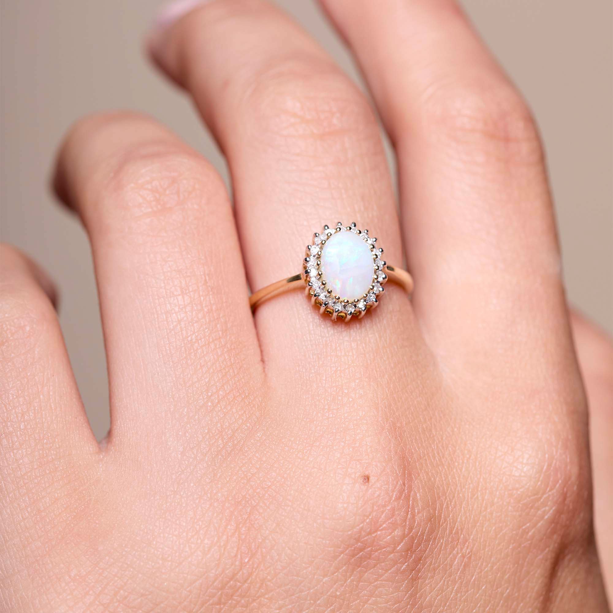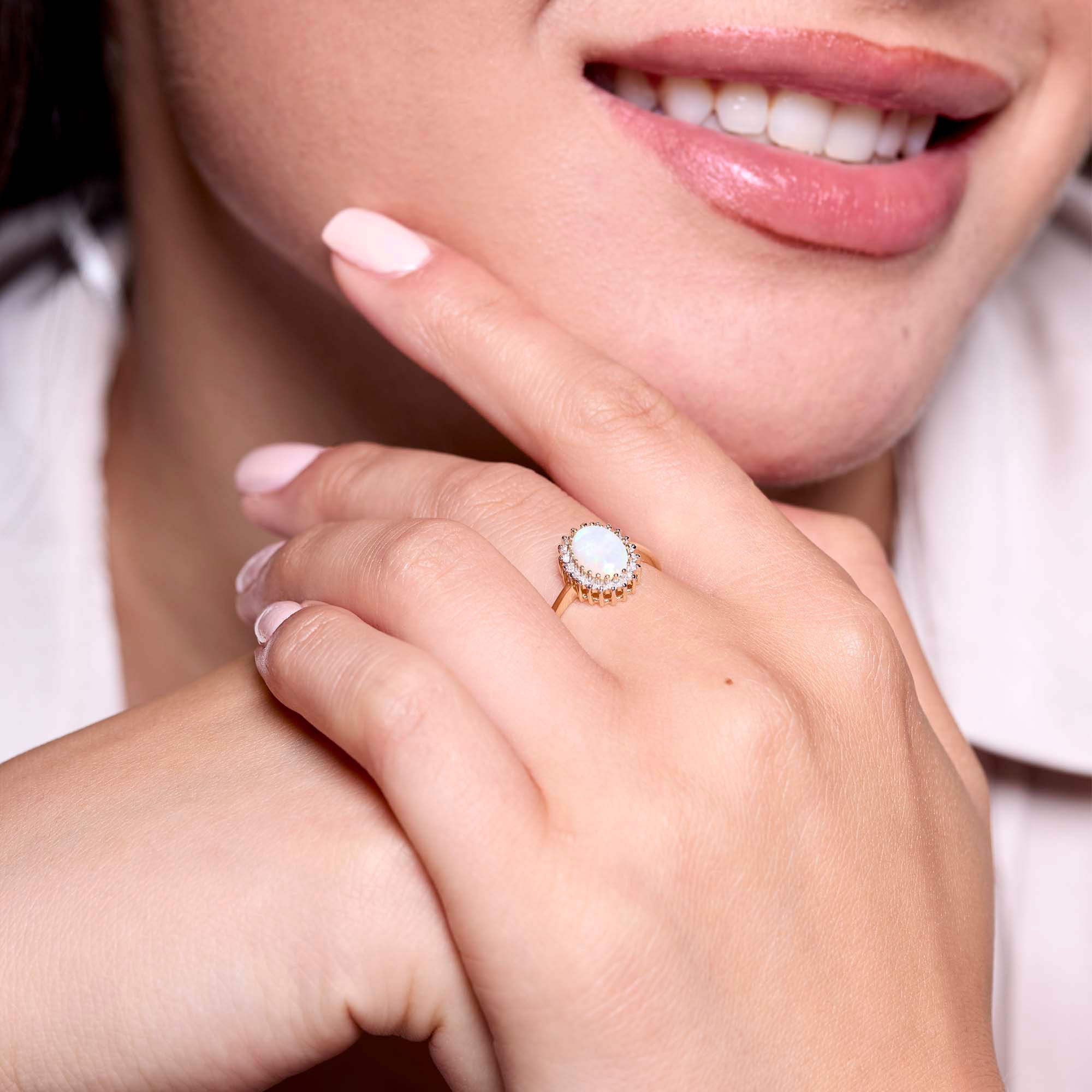 Encircling the opulent opal is a halo of hand-selected Round Brilliant Diamonds totaling 0.10ct, each chosen for their scintillating brilliance and clarity. The diamonds exude sophistication, their timeless allure enhancing the ring's overall elegance.