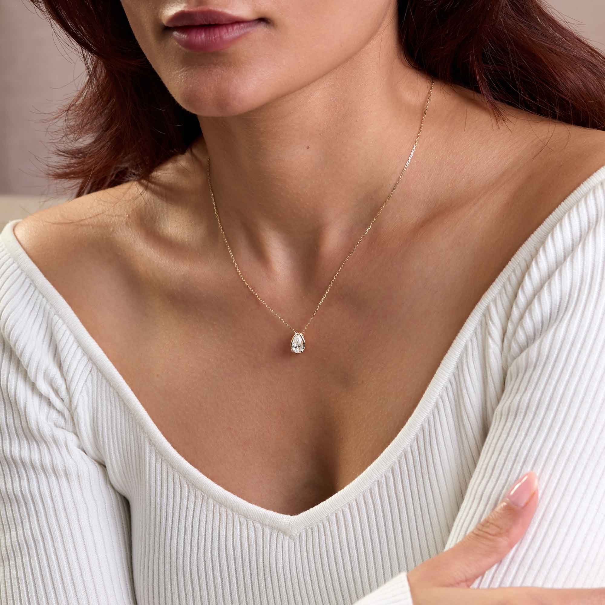 Graded F colour and VS clarity, the white lab diamond delivers bright, precise sparkle in any light. The pear shape draws the eye and flatters the neckline, making this necklace easy to wear day or night.