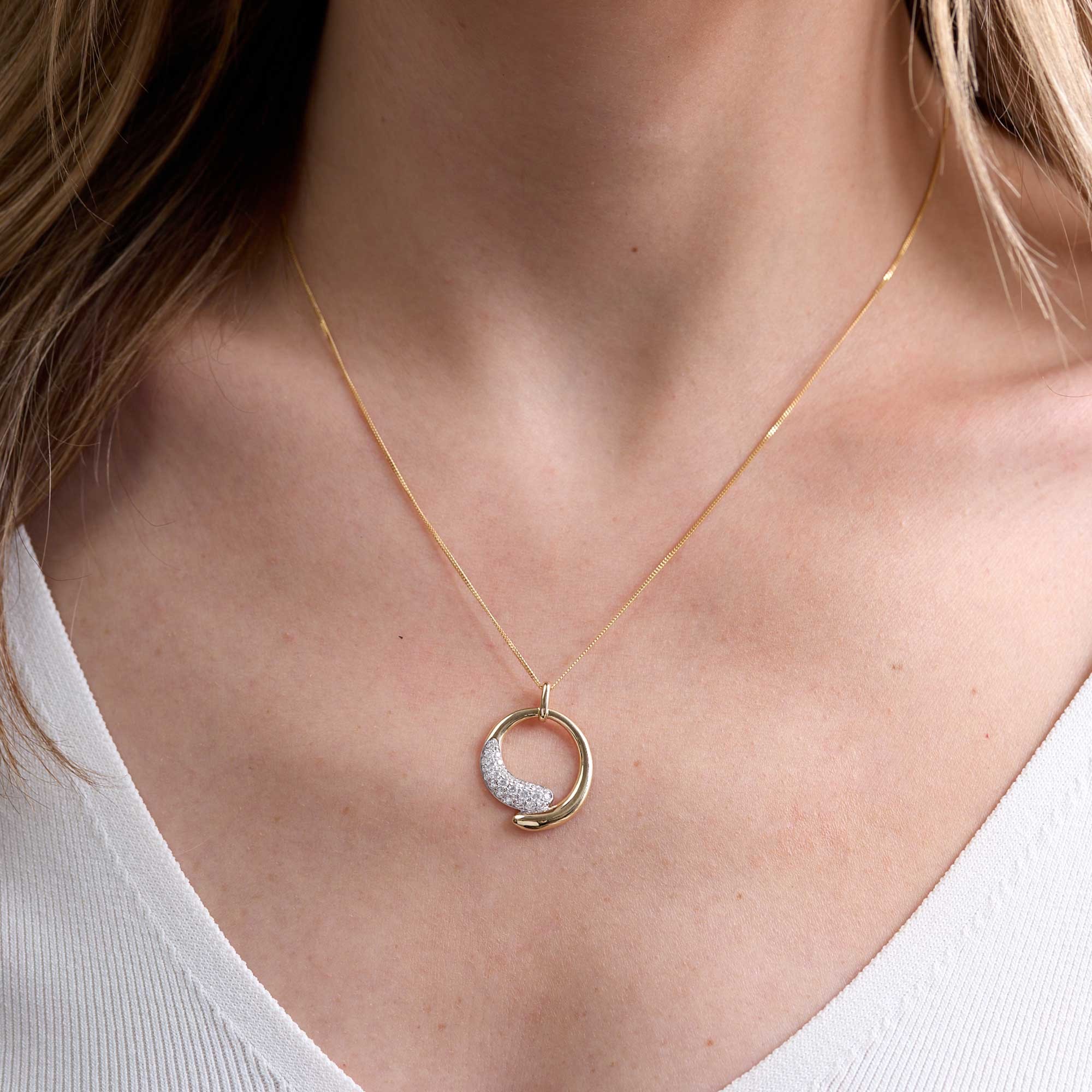 This 9ct Yellow Gold Round Brilliant 0.10ct Diamond Cross Over Pavé Circle Pendant is exclusive to Chisholm Hunter. The sleek circle is set with pavé‑set round brilliant diamonds totalling 0.10 carat. H–I colour and SI clarity give a bright, clear sparkle. The round brilliant cut maximises light return for a lively finish.