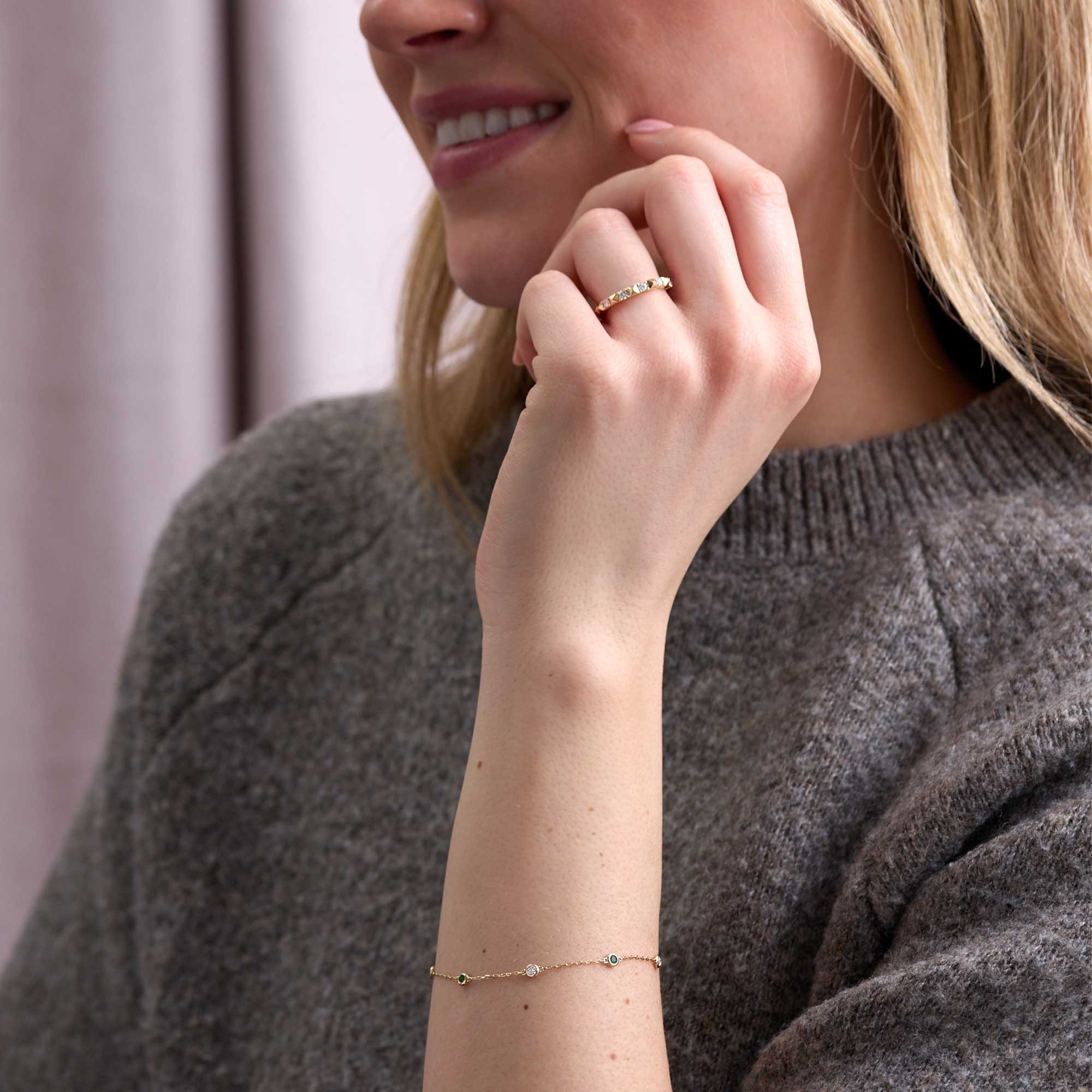 Round brilliant cuts maximise light return for clean brilliance. 9ct gold offers lasting strength and a warm finish. The slim silhouette layers well with a watch or other bracelets, and looks considered worn alone.