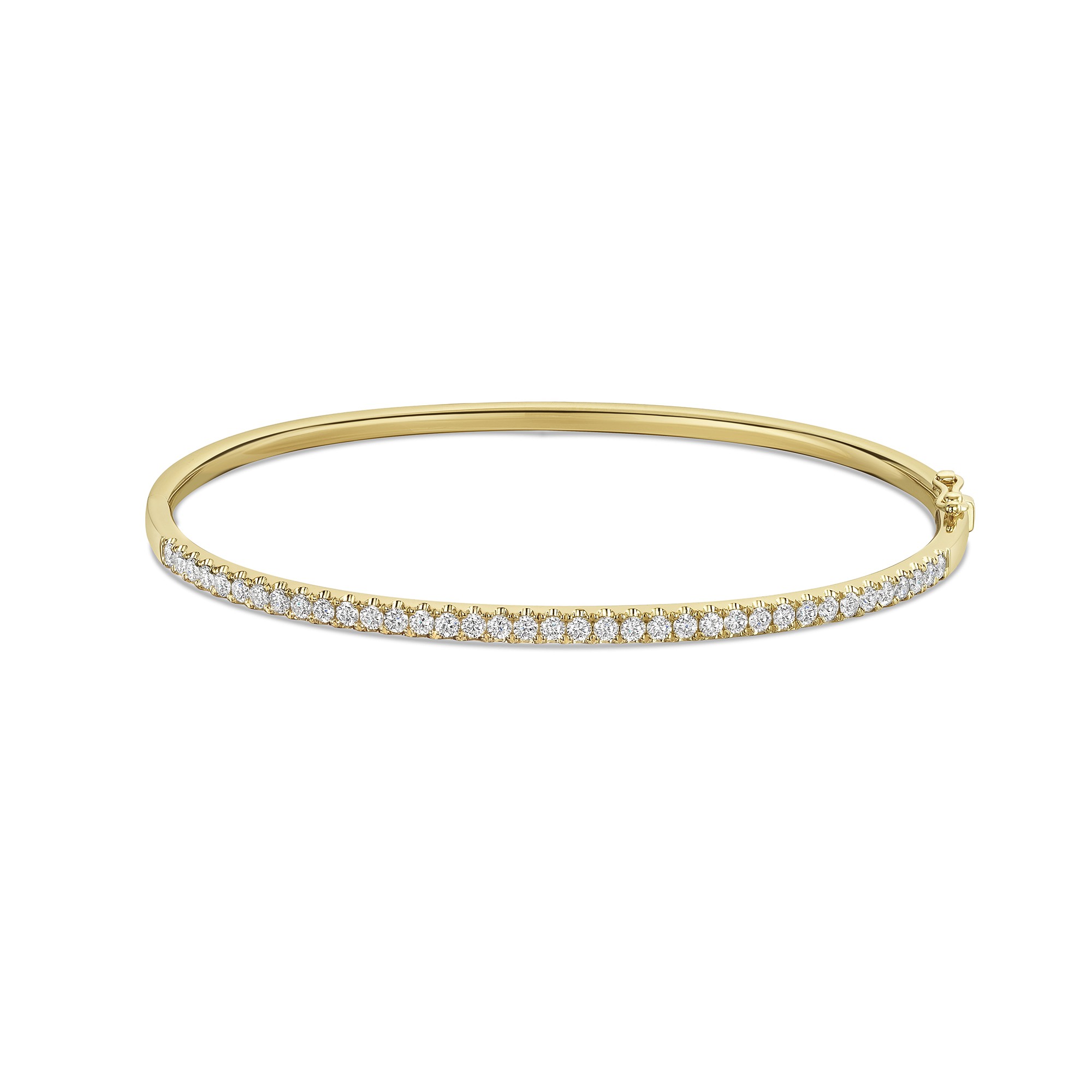 Crafted in 9ct yellow gold, this slim bangle frames a line of round brilliant cut diamonds with a total weight of 1.00ct. The cut enhances fire and scintillation, giving confident, even sparkle from every angle. The warm tone of yellow gold pairs easily with everyday outfits and occasion wear. Wear it solo for a crisp finish or stack with other bracelets for added impact.