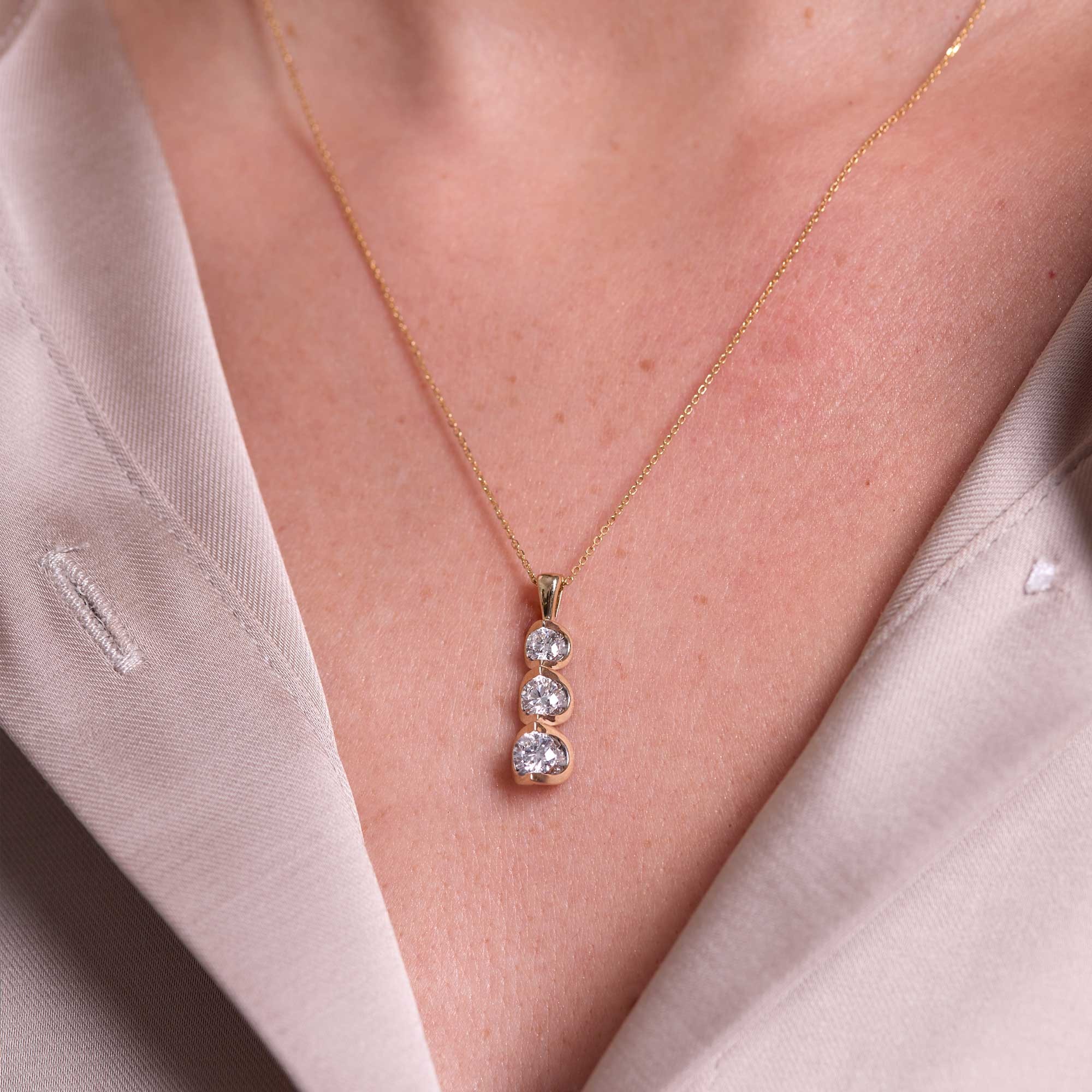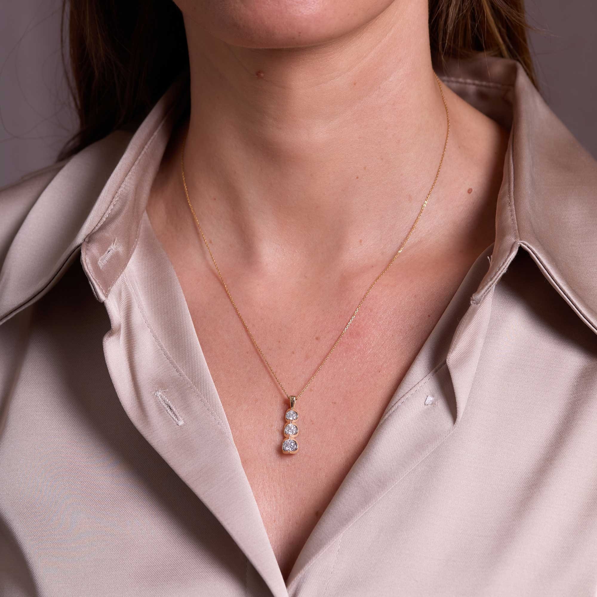 The round brilliant cut maximises sparkle and brightness. The three-stone layout marks past, present and future, giving meaning as well as style. The drop silhouette sits cleanly on the neckline and pairs with everyday looks or evening wear with ease.