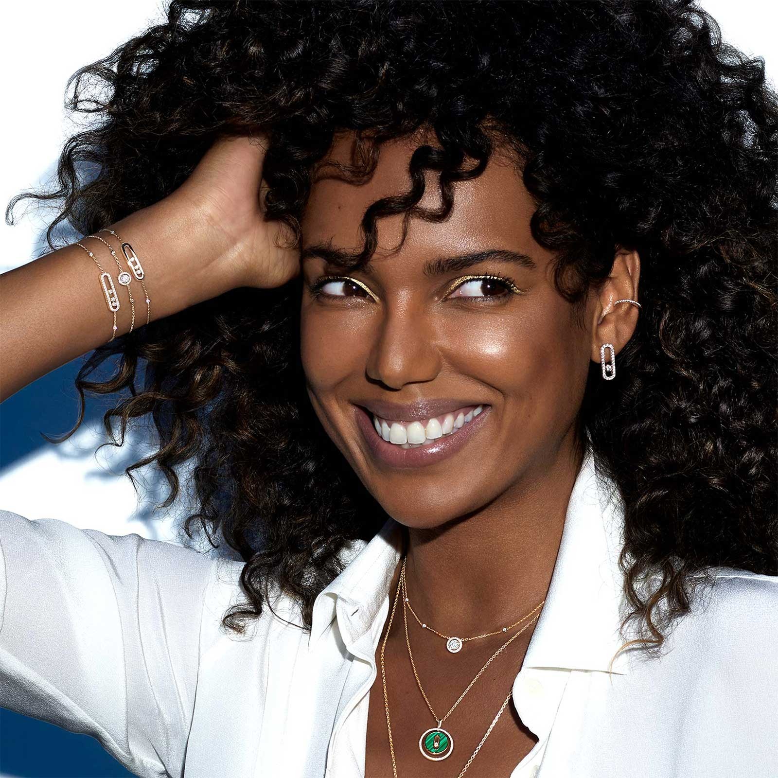 This diamond bracelet, fully handcrafted, is part of the Move luxury jewellery collection, the signature of Messika House. With its three moving diamonds that shine according to one's movements, this Baby Move yellow gold pavé diamond bracelet suits the thin wrists. This diamond bracelet is the ideal everyday companion of a woman with its pared down graphic style and delicate chain, the talisman symbol of the love of yesterday, today and tomorrow. Discover this yellow gold pavé diamond bracelet Baby Move and explore Messika's luxury bracelets creations.