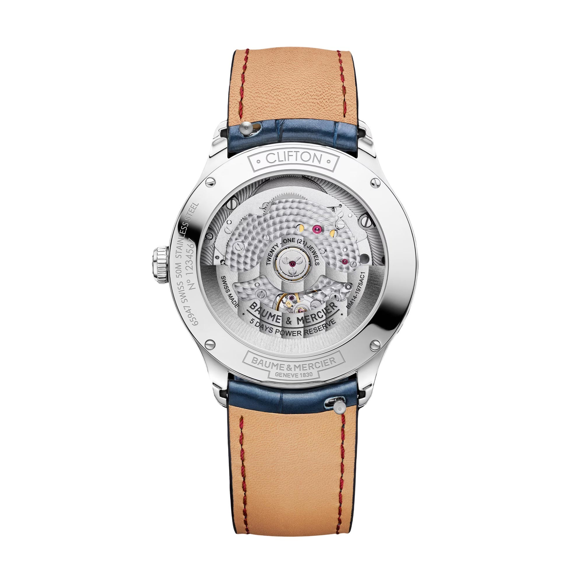 The watch case, 39 mm in diameter and 12.2 mm thick, and crown are crafted in satin-polished stainless steel. A domed scratch-resistant sapphire crystal with an anti-glare coating on both sides protects the case. Fastened with four screws, the back may be engraved. The Baumatic automatic manufacture movement is housed within this precious timepiece.