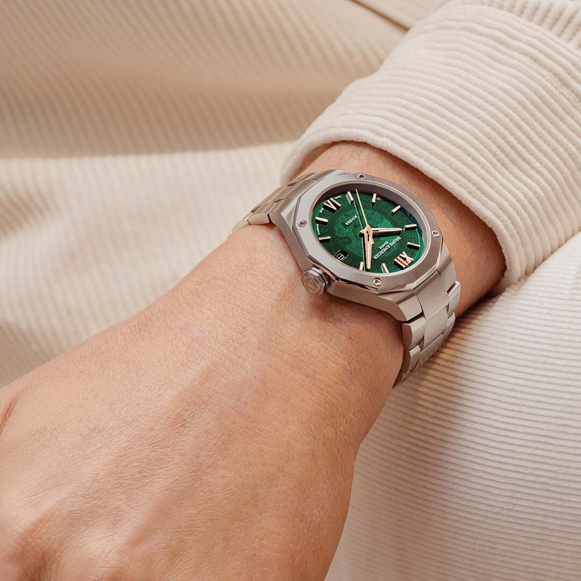 At the heart of this marvel lies its automatic movement, a symphony of precision and reliability that powers the watch. Encased within a robust stainless steel body, the silver tones of the watch case beautifully complement the stunning green dial, creating an aesthetic of understated luxury. The watch dial, adorned with Roman numerals and batons, offers an air of classical elegance combined with modern flair, ensuring legibility and style go hand in hand.