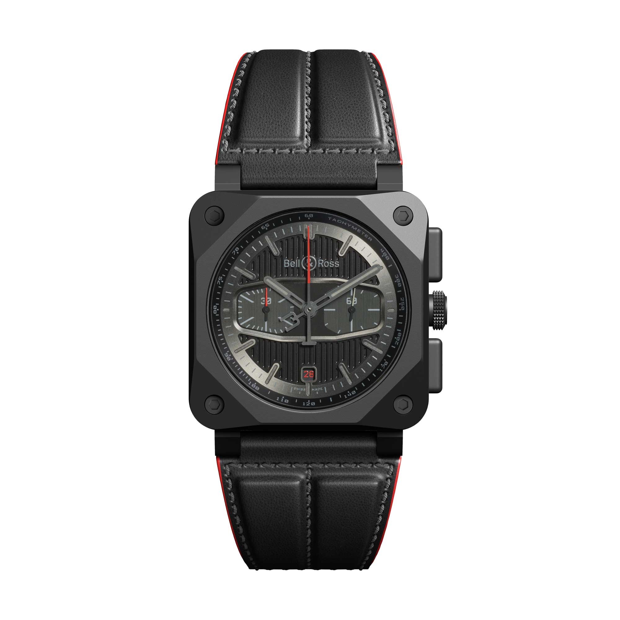 AN EXCLUSIVE STEALTH WATCH AND CHRONOGRAPH. Bikers will notice the motor-inspired black calfskin strap right away, hemmed with a red edge and lined with high-resistance technical material. The strap closes with a steel pin buckle with black PVD coating, while the quilting on the strap itself is a nod to the motorbike saddle covers and rider's suits.