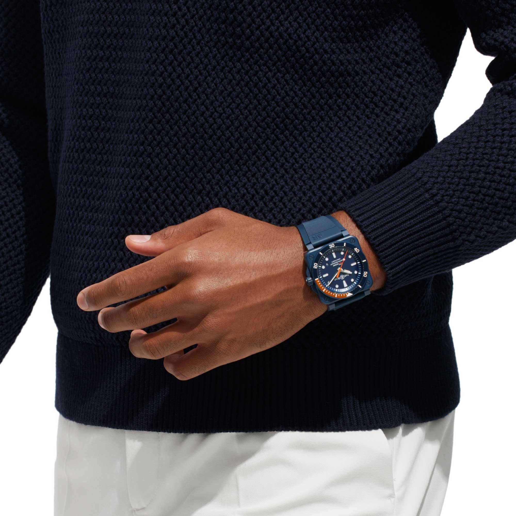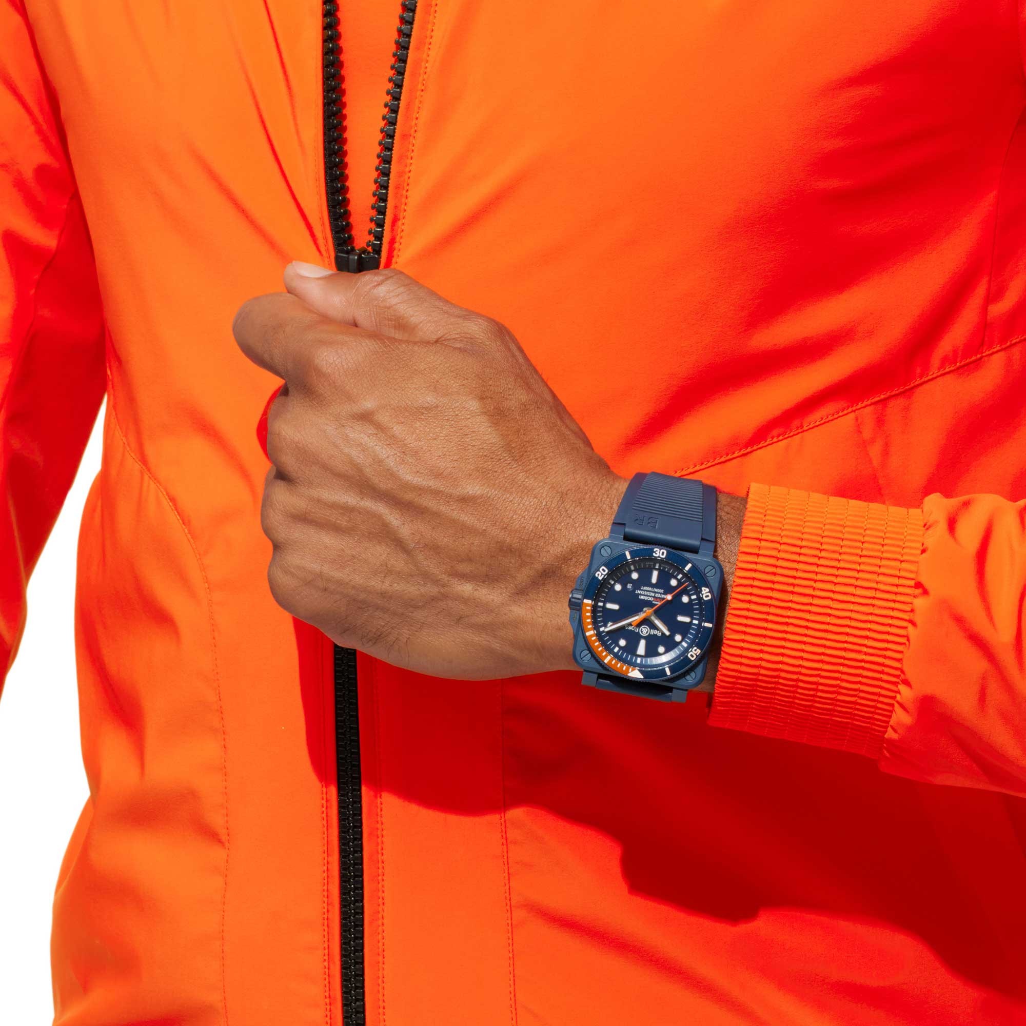 A PROFESSIONAL DIVING MODEL. Part of the BR-03 Diver collection of professional diving watches, this limited edition of 999 pieces, water-resistant to 300 metres, features a 42-mm matt blue ceramic case with a unidirectional rotating ceramic bezel in blue and orange, with a 60-minute scale. To ensure perfect legibility of the indications, the blue metal dial has applique indexes and white graduations with a Super-LumiNova® coating.