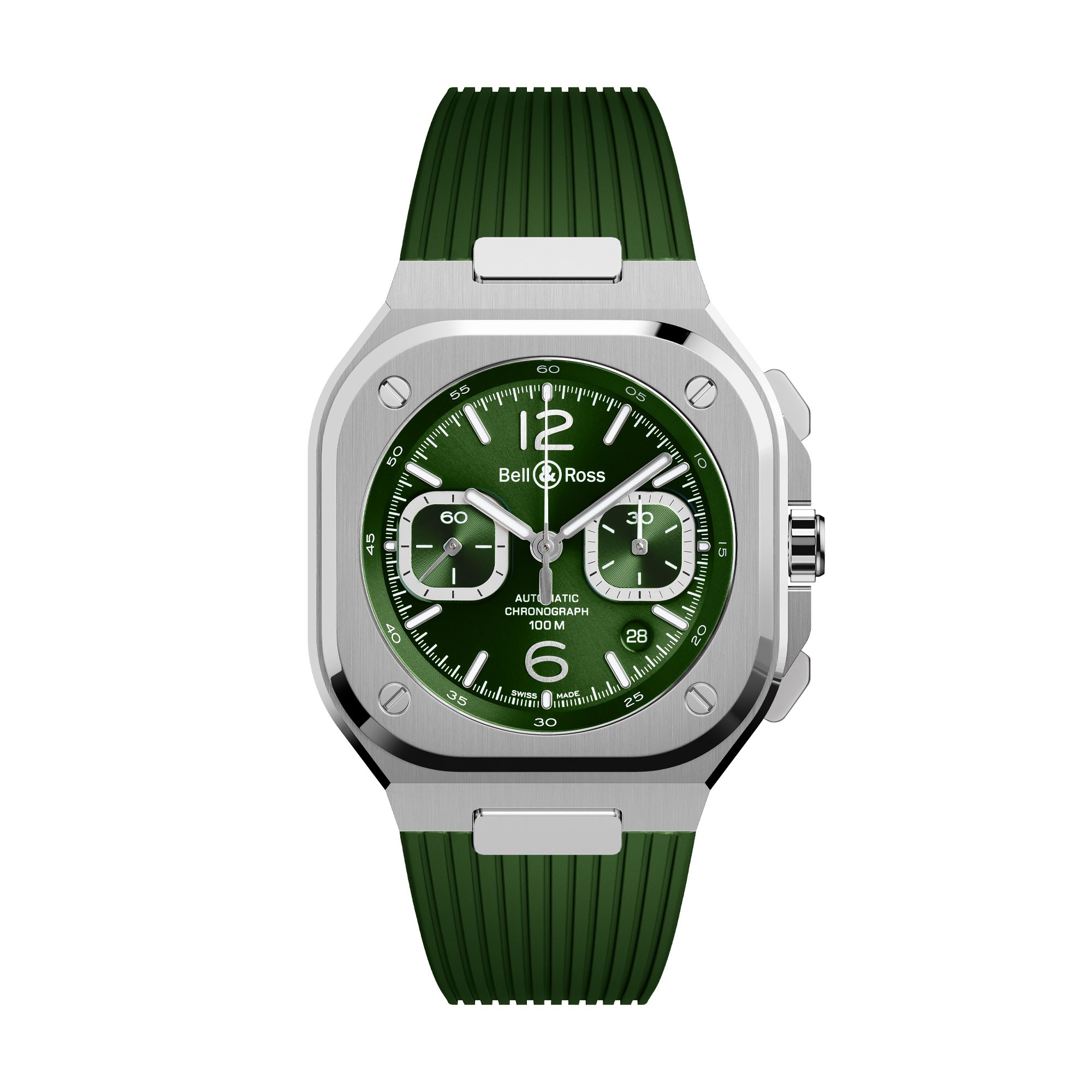An essential tool for measuring short time intervals, the chronograph is the complication most commonly used in aviation. It is also the ultimate complication for sportsmen and those leading ultra-active lives. The calibre BR-CAL.326 brings robustness, reliability and efficiency to the BR-05 Chrono Green Steel. Its rotor, which is visible through the sapphire case-back, is a complete, finely skeletonised disc: a defining signature of Bell & Ross automatic movements.