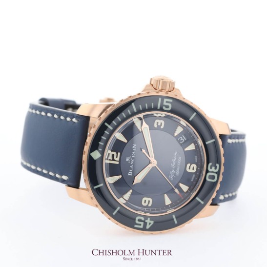 Discover the Blancpain Fifty Fathoms Automatique Mens Watch 5015 3603C 63B, available at Chisholm Hunter. The Fifty Fathoms collection was developed as Jean-Jacques Fiechter, an avid diver, noticed a gap in the market for a diver’s watch that maintained its performance and accuracy deep underwater. This impressive diver’s timepiece boasts a 45mm red gold case with a unidirectional bezel and luminescent indexes and hands for readability when diving or in low-light conditions. The timepiece is powered by the Blancpain calibre 1315 movement and is water resistant up to 300 metres.