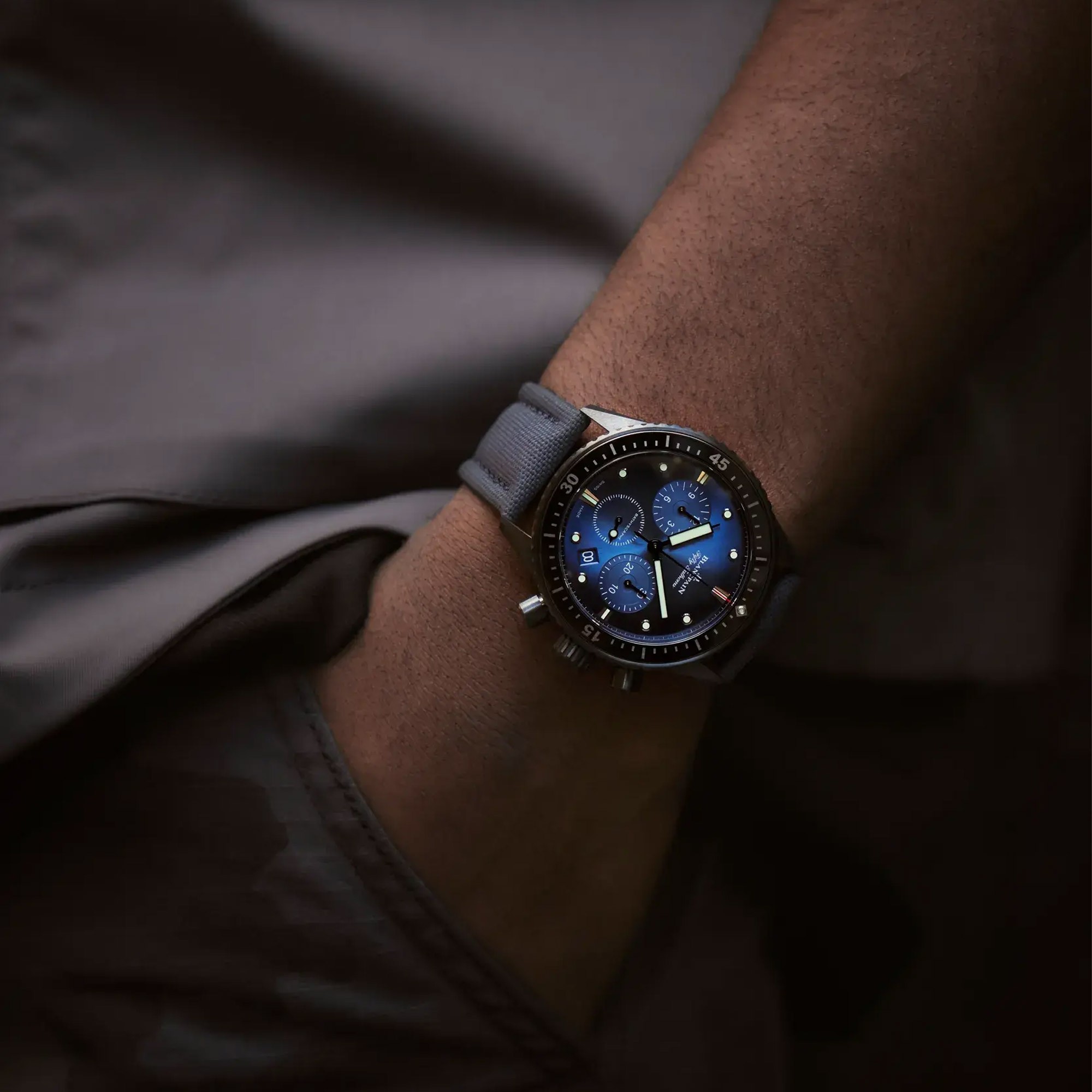 The striking sunburst blue dial features dot and baton markers, providing clear visibility in various lighting conditions. A unidirectional satin-brushed black ceramic bezel with a ceramic insert complements the dial, making it a perfect blend of durability and style. The Liquidmetalâ„¢ hour-markers add a modern touch, enhancing the watch's contemporary appeal.