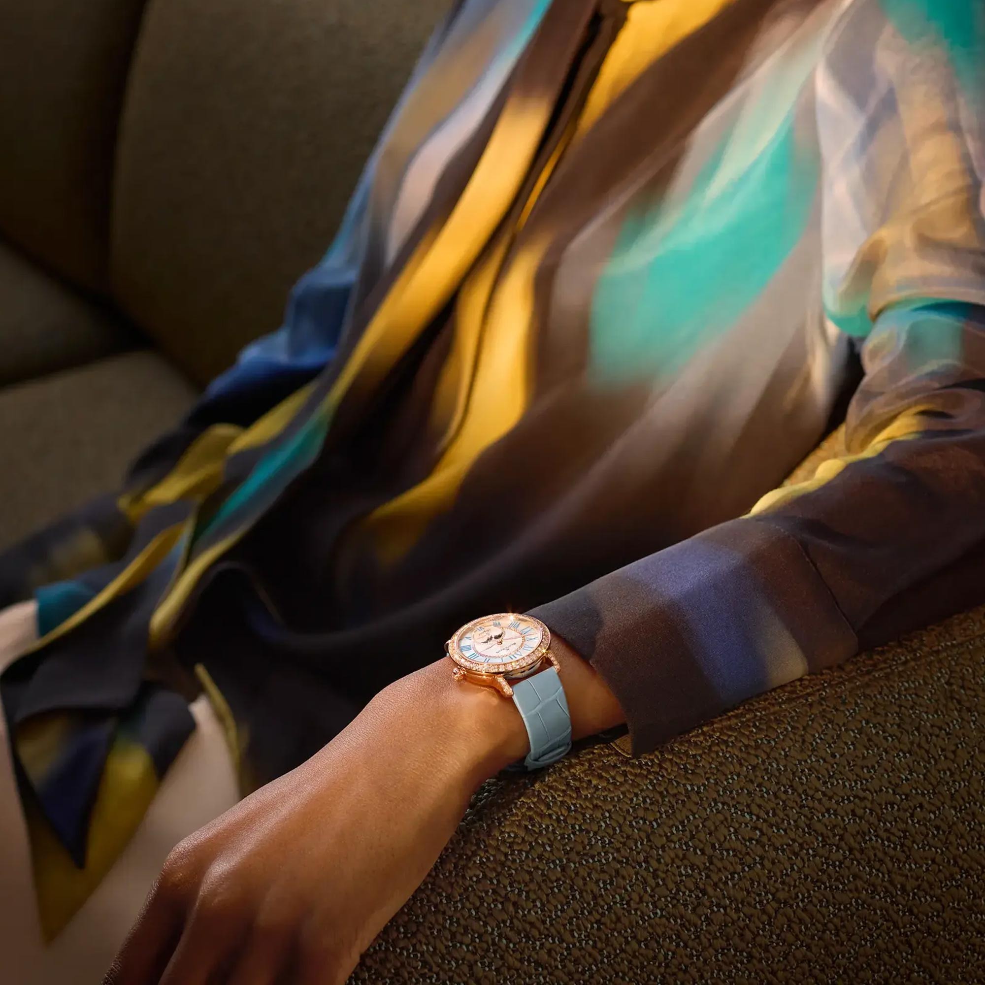 The stunning dial, crafted from Mother of Pearl, is adorned with Roman numerals, providing an air of timeless beauty while the sapphire crystal glass ensures enduring clarity and resilience. Boasting a silicon balance spring and a remarkable power reserve of 100 hours, with 243 meticulously engineered components and 30 jewels, this watch is a testament to fine Swiss craftsmanship.
