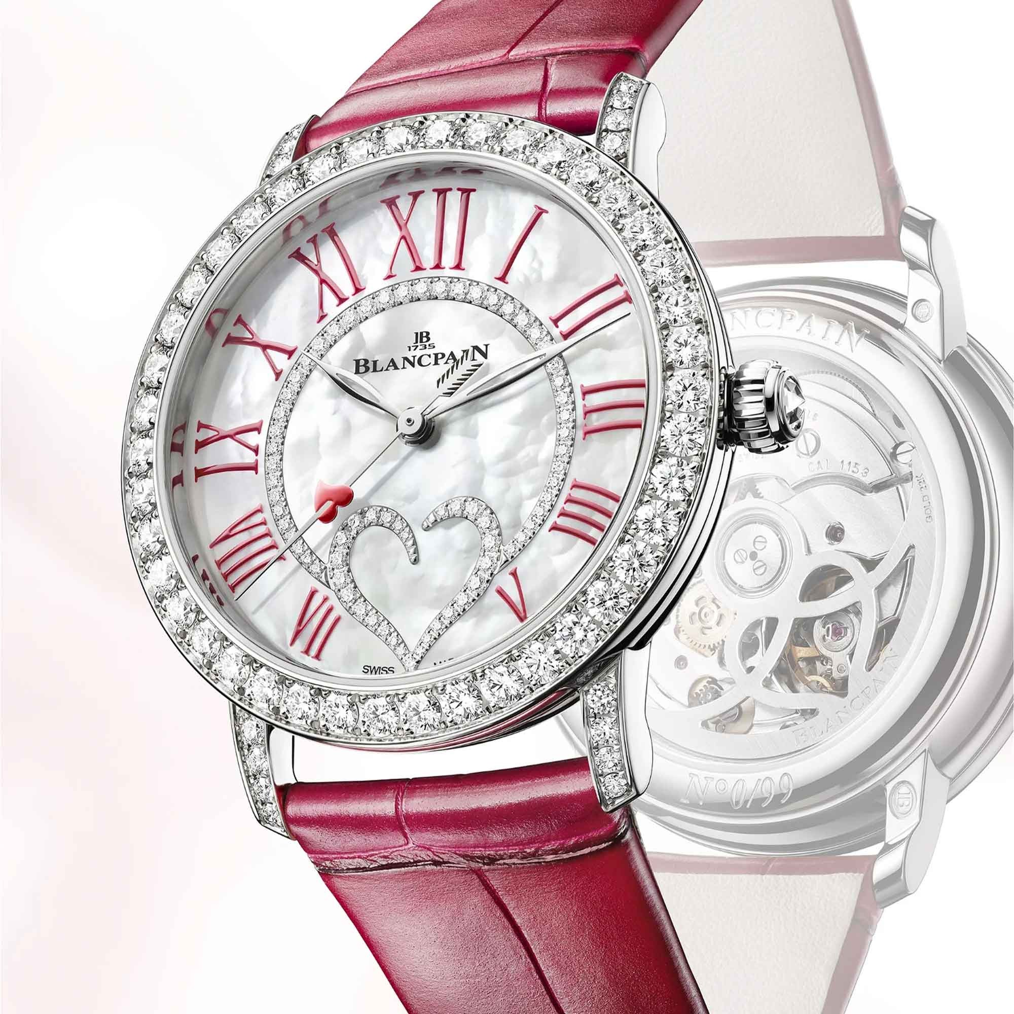 o'clock, set by hand with graduated diamonds. For the Valentine's edition, the lower portion of the