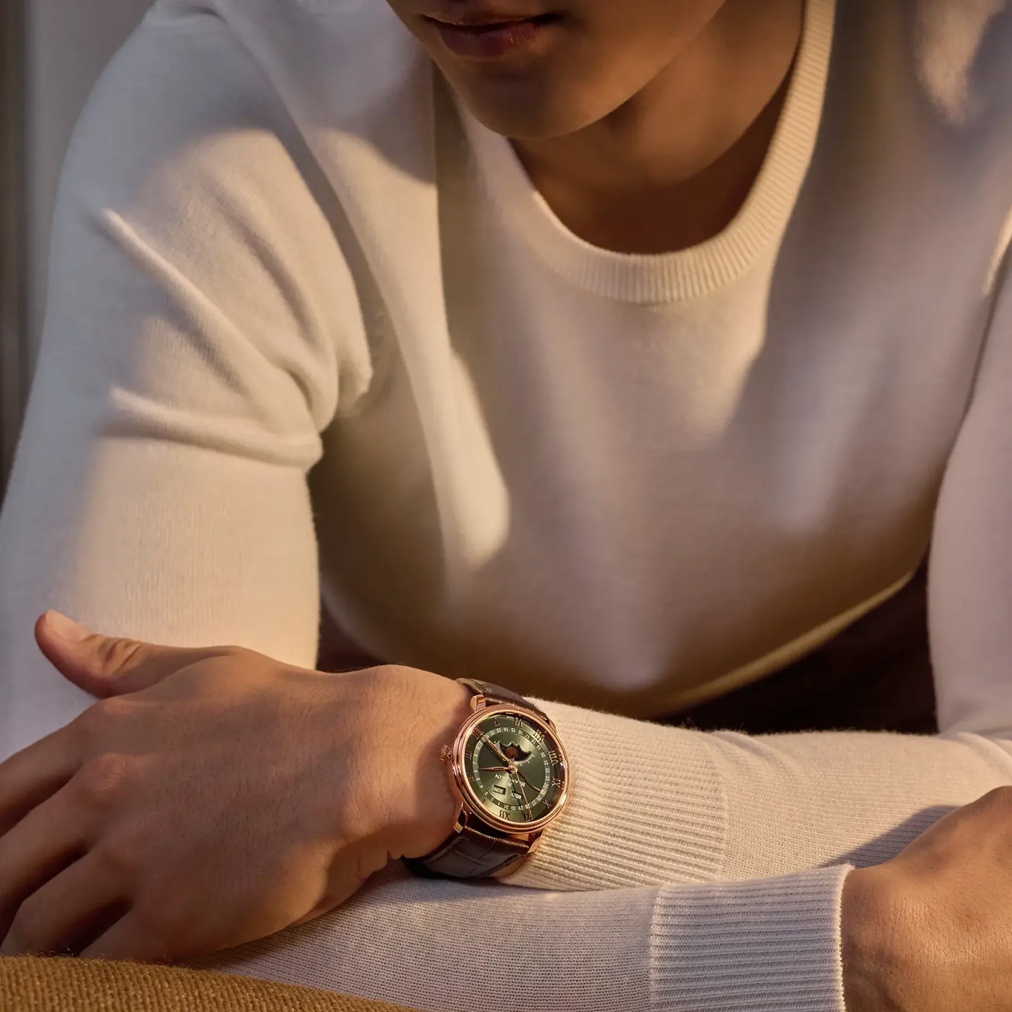 The watch is powered by a highly efficient automatic movement, a testament to Blancpain’s dedication to precision and craftsmanship. Complemented by a robust 321 components and 28 jewels, its silicon balance spring ensures durability and accuracy. Encased in luxury, the round case is crafted from sumptuous rose gold, offering a refined contrast to the rich green hue of the dial.