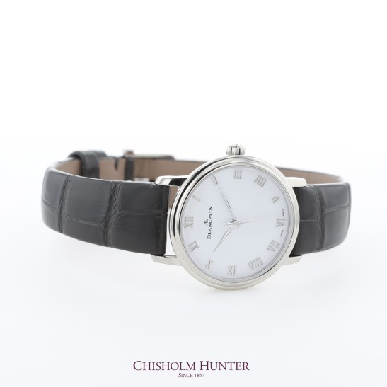 Blancpain is very much the pioneers in ladies’ watchmaking. Creating the very first automatic movement for women as early as 1930. They continue to produce avant-garde watch designs for women that push the boundaries of watch making. Creating complications that were only seen in timepieces for men. The Blancpain Ultra plate Ladies Watch has a feminine, 29mm, stainless steel, ultrathin case. The white dial is clean and classic with silver roman numerals marking passing hours along with matching clock hands. Housed within is an advanced automatic movement with impressive 40 hour power reserve. The calibre 913 sophisticated movement is made from 174 components and contains 20 jewels. A sapphire crystal glass protects the dial and movement within. Water resistant up to 30 meters. This luxurious timepiece is completed with a black alligator leather strap. This watch comes with a Blancpain official 2 year guarantee and presentation packaging.