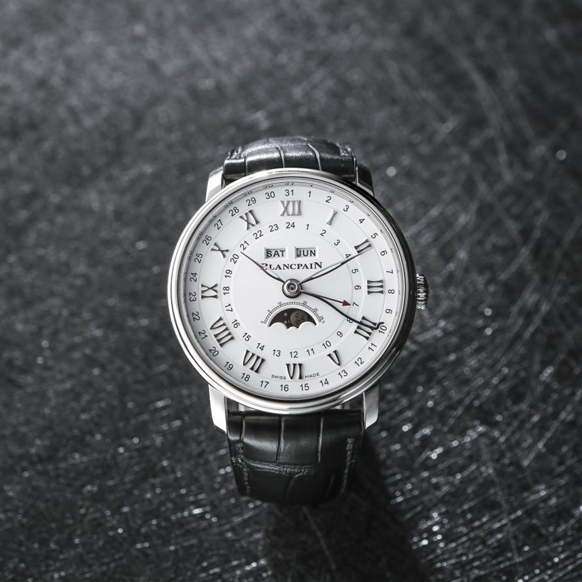 Villerret, the village of Blancpain's birth; anchored in tradition, the new models reaffirm our attachment to genuine watchmaking values, as seen with the introduction of dials in grand feu enamel and serpentine hands in blued steel for calendar indication. The classic white dial has a calendar display as well as GMT function. The day-month function features below the 12 o'clock position while the Moon phase aperture can be found above the 6 o'clock position. The surrounding date display is signified by the blue hand which points to the current date. A red tipped GMT hand points towards the second time zone indicators, enabling two simultaneous time displays. Finally, the Villeret Quantieme Complete GMT is finished by being presented on a black alligator leather strap. Housed in a polished stainless steel 40mm casing, this timepiece has 3 Bar water resistance. Visible through the sapphire case back, is automatic Calibre 67A5 self-winding movement; with an incredible power reserve of 72-hours. All Blancpain watches come with a 2-year international warranty and Blancpain presentation packaging.