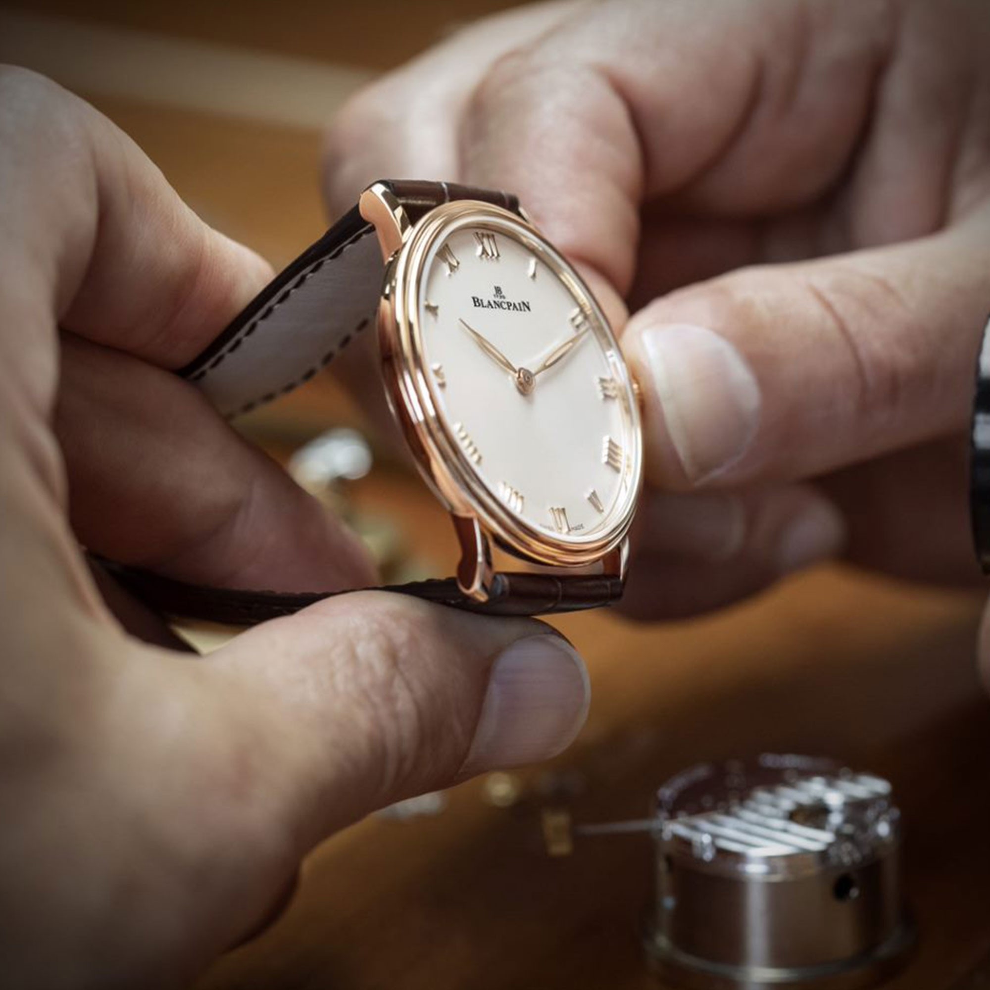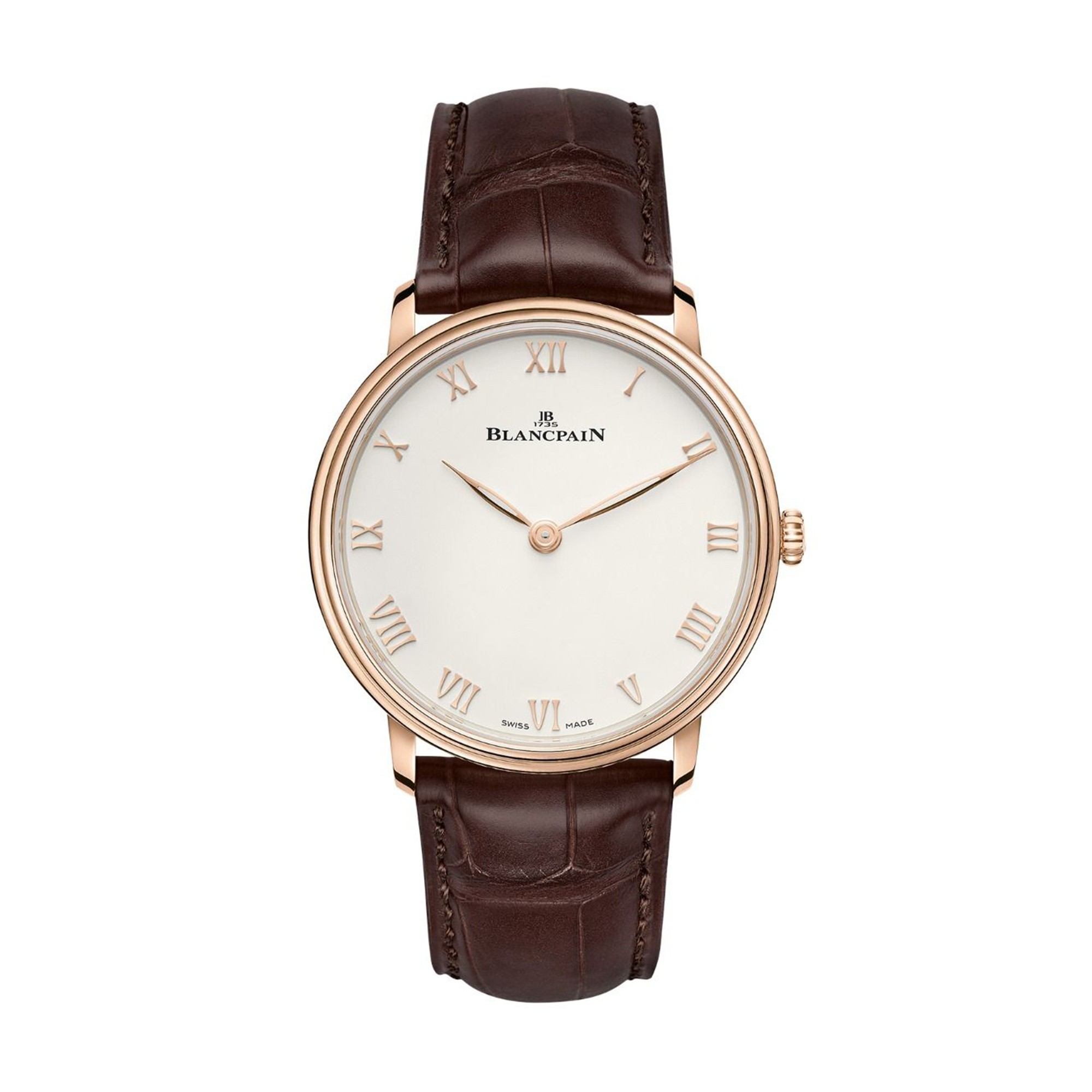 Villerret, the village of Blancpain's birth; anchored in tradition, the new models reaffirm our attachment to genuine watchmaking values, as seen with the introduction of dials in grand feu enamel and serpentine hands in blued steel for calendar indication. Blancpain 'Villeret' collection represents refinement and classicism combined with ground breaking movements. Blancpain's most classic collection, the ultra plate model displays a simple beauty by only showing hours and minutes without the date and second hand. The dial features a domed white opaline face with rose gold roman numeral hour marker indexes and skeletonized hands. The 18ct rose gold 40mm case houses the dial set beneath sapphire crystal for additional protection. This Blancpain model comes presented on a brown alligator strap secured by pin buckles, also available with mesh bracelets as well. The Blancpain Ultra plate is powered by Calibre 11A48 movement with a power reserve of 95-hours. Water resistant to 30 metres. All Blancpain watches come with a 2-year international warranty and Blancpain presentation packaging.