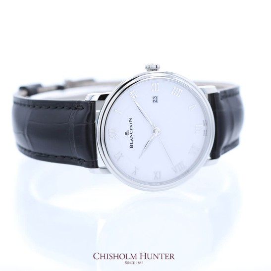 Villerret, the village of Blancpain's birth; anchored in tradition, the new models reaffirm our attachment to genuine watchmaking values, as seen with the introduction of dials in grand feu enamel and serpentine hands in blued steel for calendar indication. Blancpain 'Villeret' collection represents refinement and classicism combined with ground breaking movements. The Blancpain Villeret Ultra Slim Automatic Watch showcases a white dial with silver-tone roman numeral indexes and Feuillet hands. The Round stainless steel 40mm case houses an open sapphire crystal back and a date indicator at 3 o'clock. Presented on a black alligator leather strap with a deployment buckle closing mechanism. The Blancpain Ultra plate is a classical gentleman's wristwatch powered by an extra-thin self winding movement in the form of a Calibre 1151. This automatic movement has a power reserve of 100 hours. All Blancpain watches come with a 2-year international warranty and Blancpain presentation packaging.