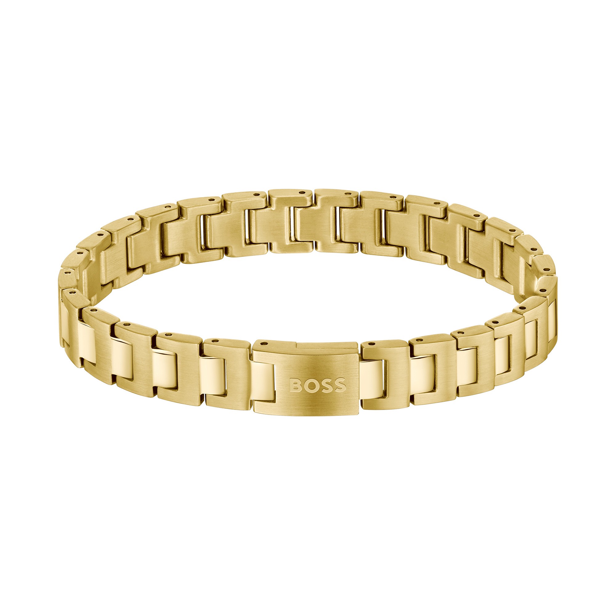 Introducing the BOSS Candor Gold Plated Stainless Steel Link Men's Bracelet 1580753, an accessory that defines modern elegance. Crafted from robust stainless steel, this bracelet showcases a striking gold plating that exudes luxury while remaining durable for everyday wear.