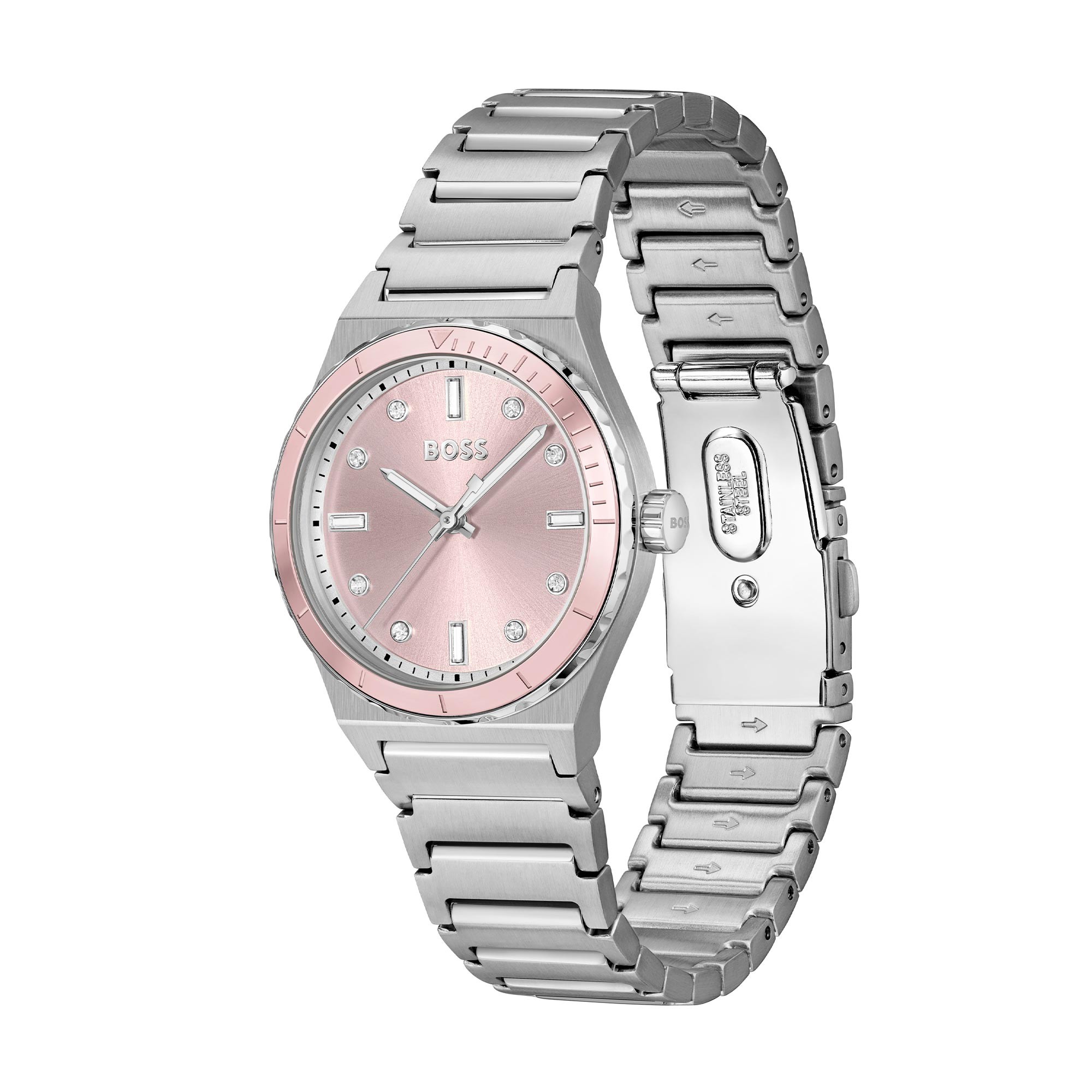 Introducing the BOSS Candor Sport 32mm Quartz Ladies Watch 1502788, a sophisticated timepiece that embodies elegance and functionality. This watch features a precise quartz movement, ensuring accurate timekeeping. The striking pink dial, complemented by stone-set dot and baton markers, adds a modern touch that is both stylish and easy to read.