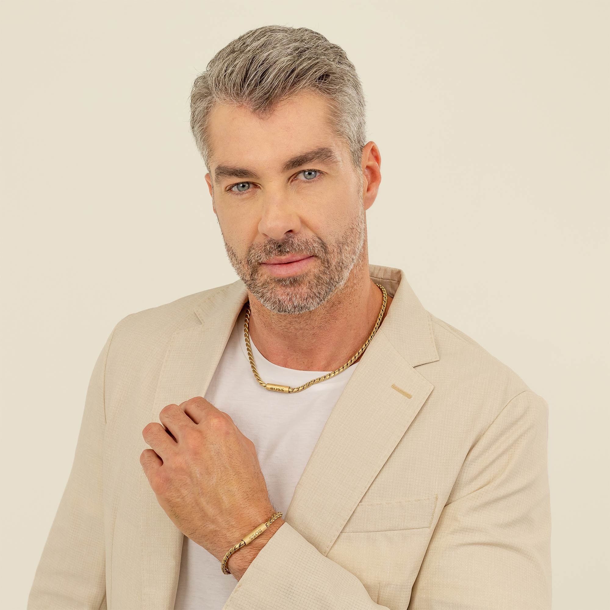 Perfect for those who appreciate refined and contemporary accessories, the BOSS Doran bracelet seamlessly integrates with a discerning lifestyle. Whether worn alone or layered with other pieces, it adds a touch of elegance and confidence to any ensemble. Embrace a timeless accessory with the BOSS Doran Yellow Gold-Tone Gents Bracelet.