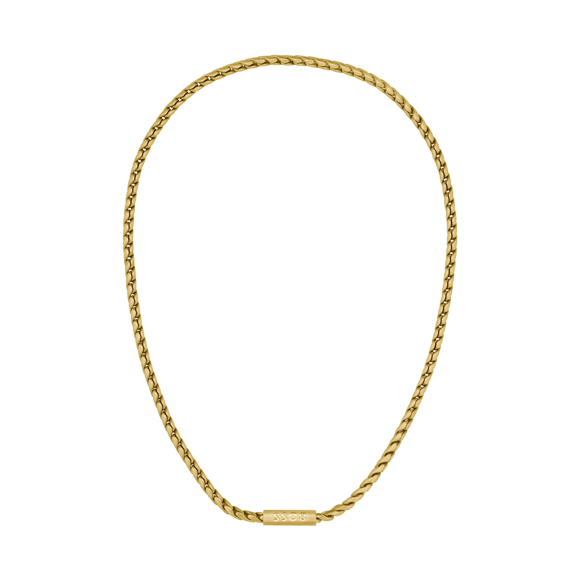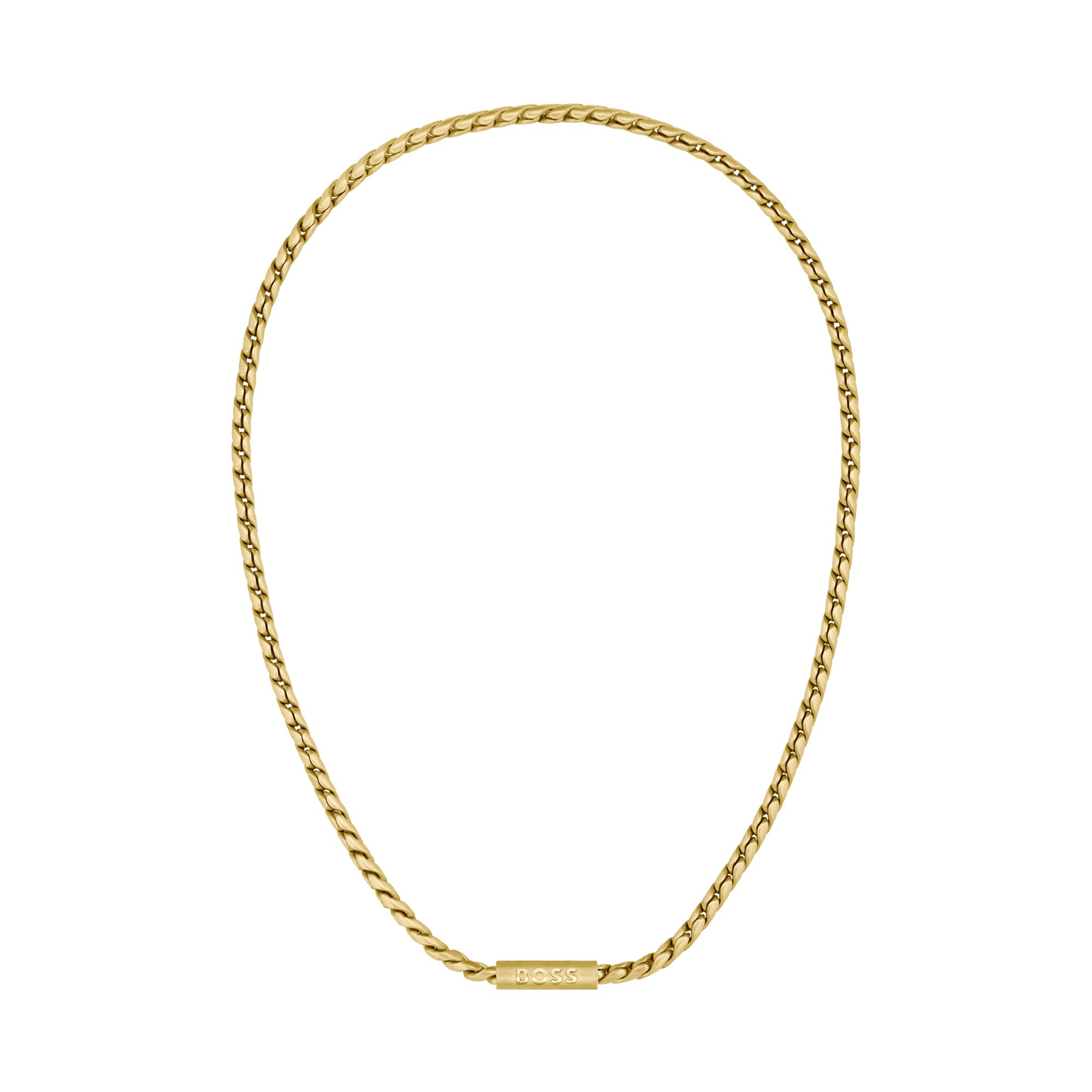 Introducing the BOSS Doran Yellow Gold-Tone Gents Necklet 1580694, a perfect addition to any man's accessory collection. Crafted from durable stainless steel, this necklet combines strength with elegance. Its striking yellow gold-tone finish offers a contemporary touch, making it suitable for both casual and formal occasions.