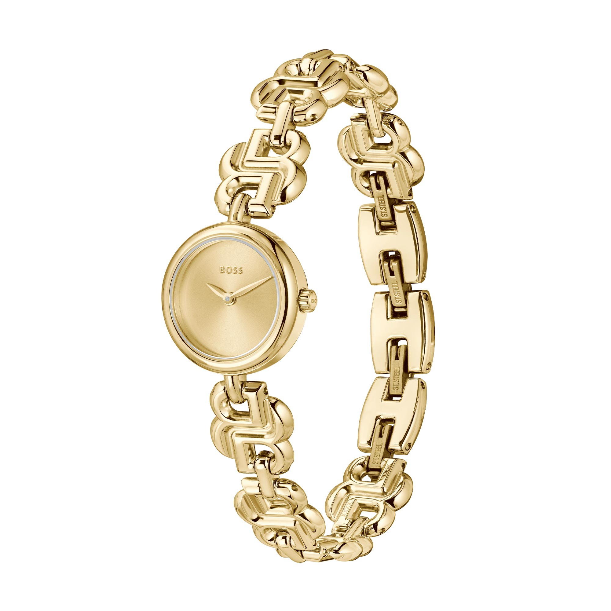 Introducing the BOSS Double B 23mm Ladies Watch 1502794, a perfect blend of elegance and functionality. Designed for the modern women, this timepiece showcases a gold dial that exudes sophistication. The watch features a clean design with clear gold dial, emphasising its minimalist charm. Constructed with durable mineral crystal glass, it maintains clarity and resists scratches.