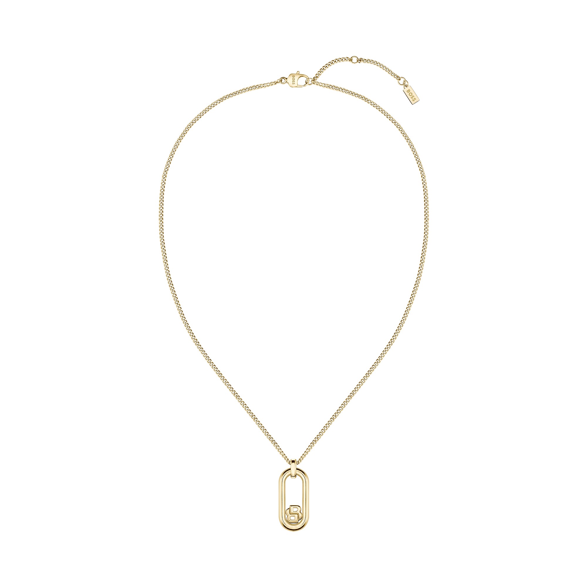 Introducing the Hugo Boss Double B 1580627 pendant necklace, a statement piece crafted from gold-tone steel for a sophisticated touch to your everyday attire. This elegant necklace features a striking Double B monogram pendant, combining style and brand prestige seamlessly.
