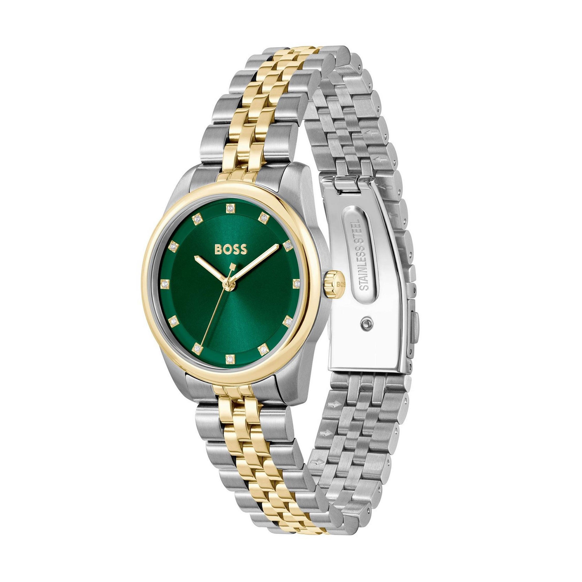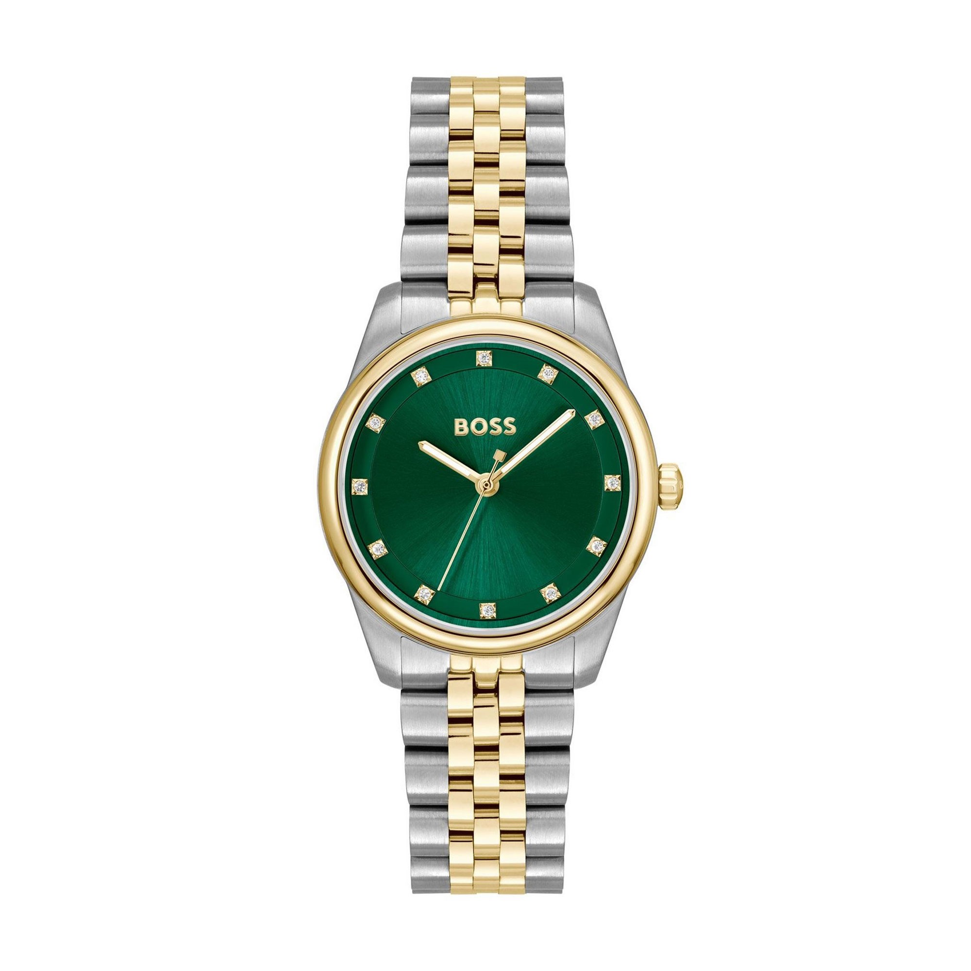 Introducing the BOSS Graceful Precious 32mm Ladies Watch 1502834, an elegant timepiece crafted for modern women. This watch features a reliable quartz movement, ensuring precision with every tick. The striking green dial is adorned with sparkling crystal dot markers. The mineral crystal glass offers durability while enhancing visibility.