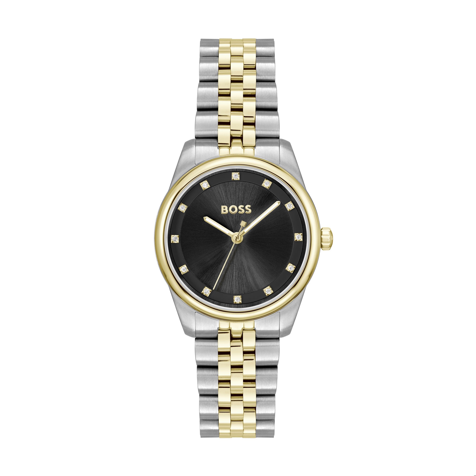 Experience elegance with the BOSS Graceful Two Tone Crystal Ladies Watch 1502811. This sophisticated timepiece features a stylish black dial with crystal dot markers, shielded by durable mineral crystal glass. Its quartz movement ensures precise timekeeping, making it a reliable companion for daily activities or special occasions.