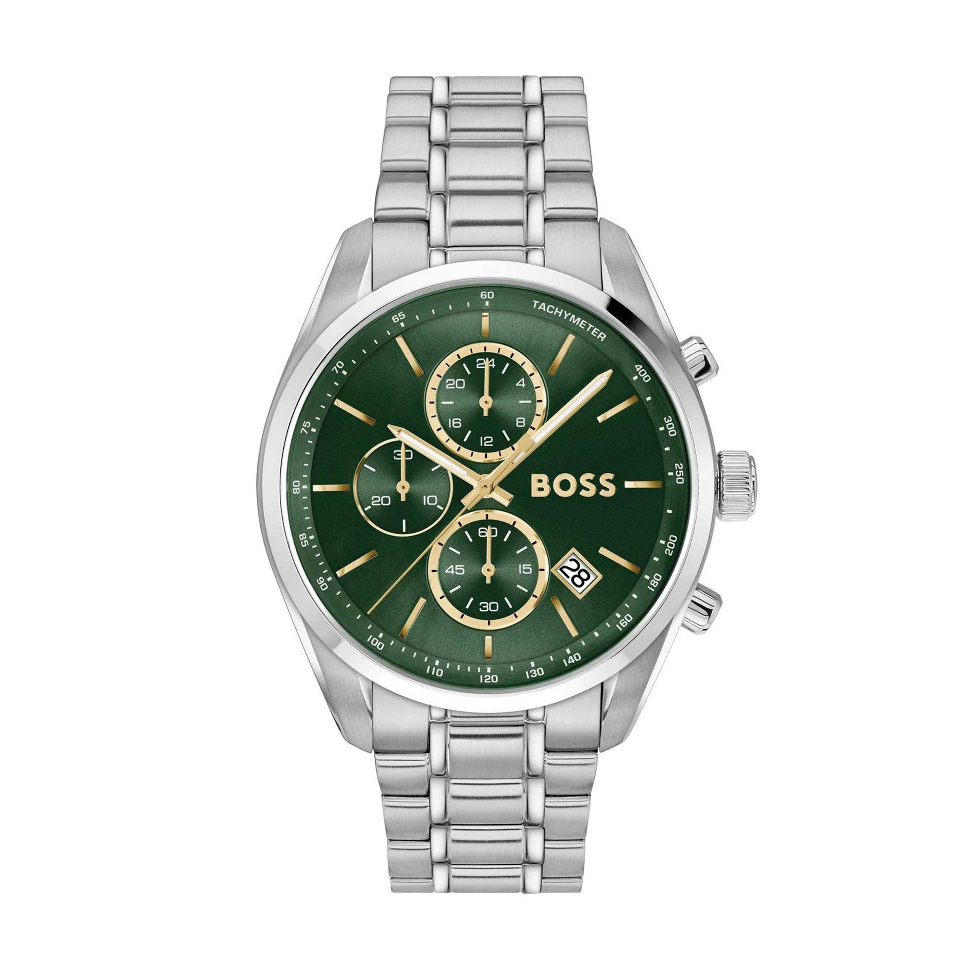 Introducing the BOSS Grand Prix Chronograph 44.5mm Men's Watch 1514266, a perfect blend of style and functionality. This timepiece features a precise quartz movement that delivers accurate timekeeping for your daily activities. The eye-catching green dial is complemented by sleek baton markers that enhance readability.