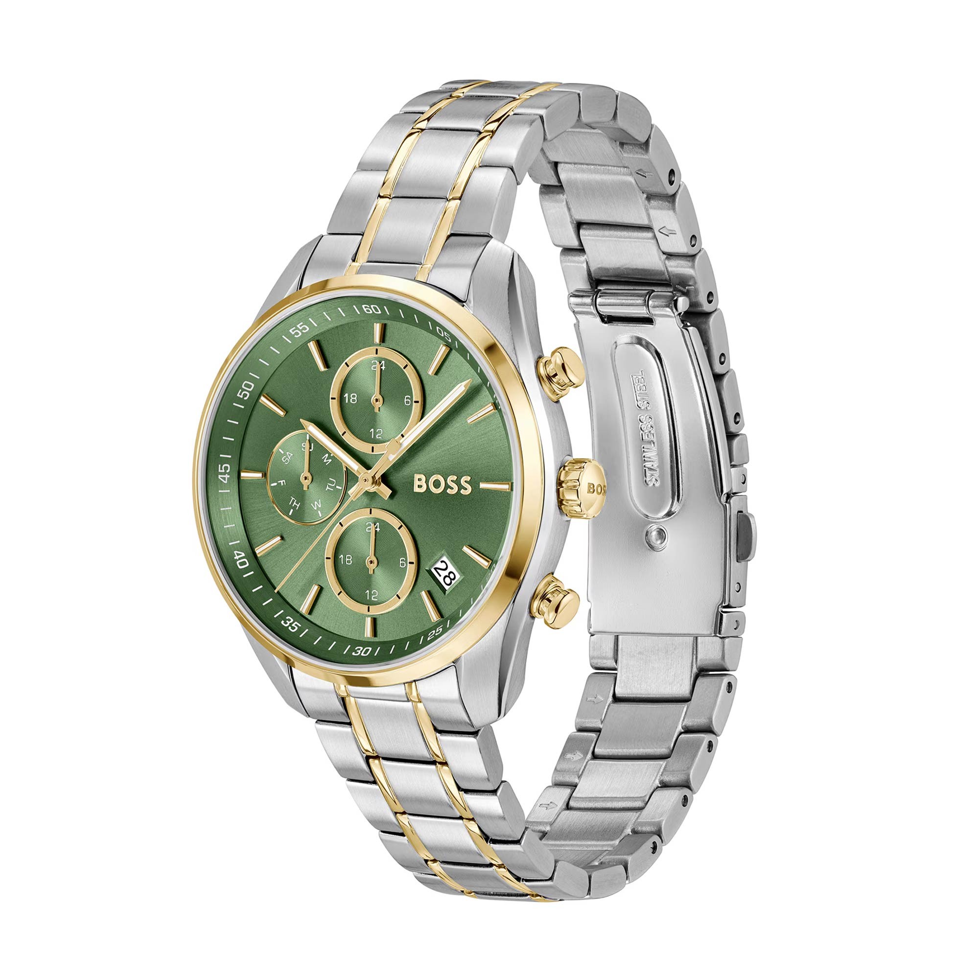 Introducing the exquisite BOSS Grand Tour Quartz 38mm Stainless Steel and Yellow Gold Tone Chronograph Ladies Watch, a marvel of modern craftsmanship that combines timeless elegance with precise functionality. Model number 1502766 is more than just a timepiece; it’s a statement of sophistication and style.