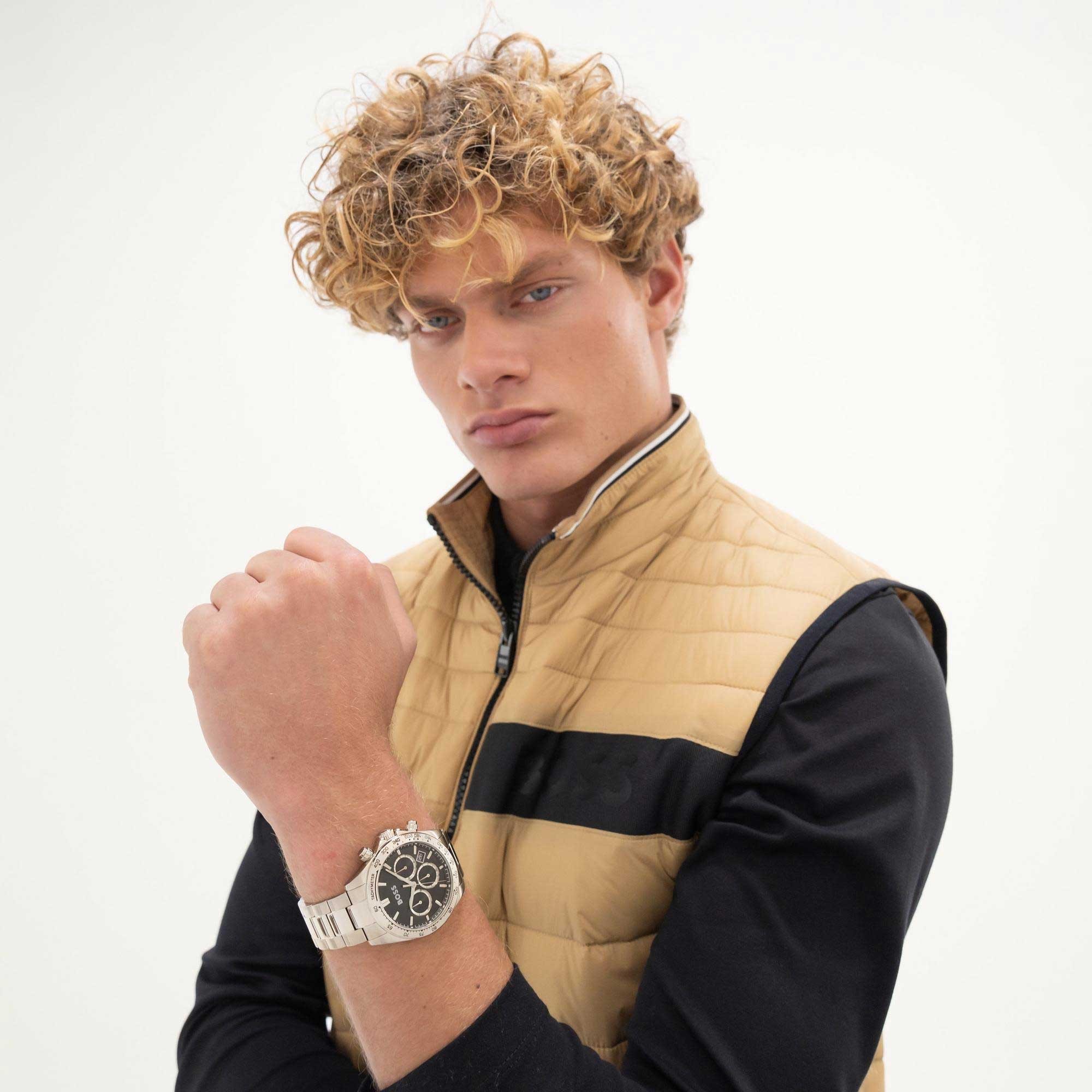 Housed in a robust round stainless steel case, with a silver finish, the BOSS Hero 2.0 maintains a polished look. The metal bracelet strap adds to its overall allure, combining comfort with elegance. The deployment clasp secures the watch snugly on the wrist.