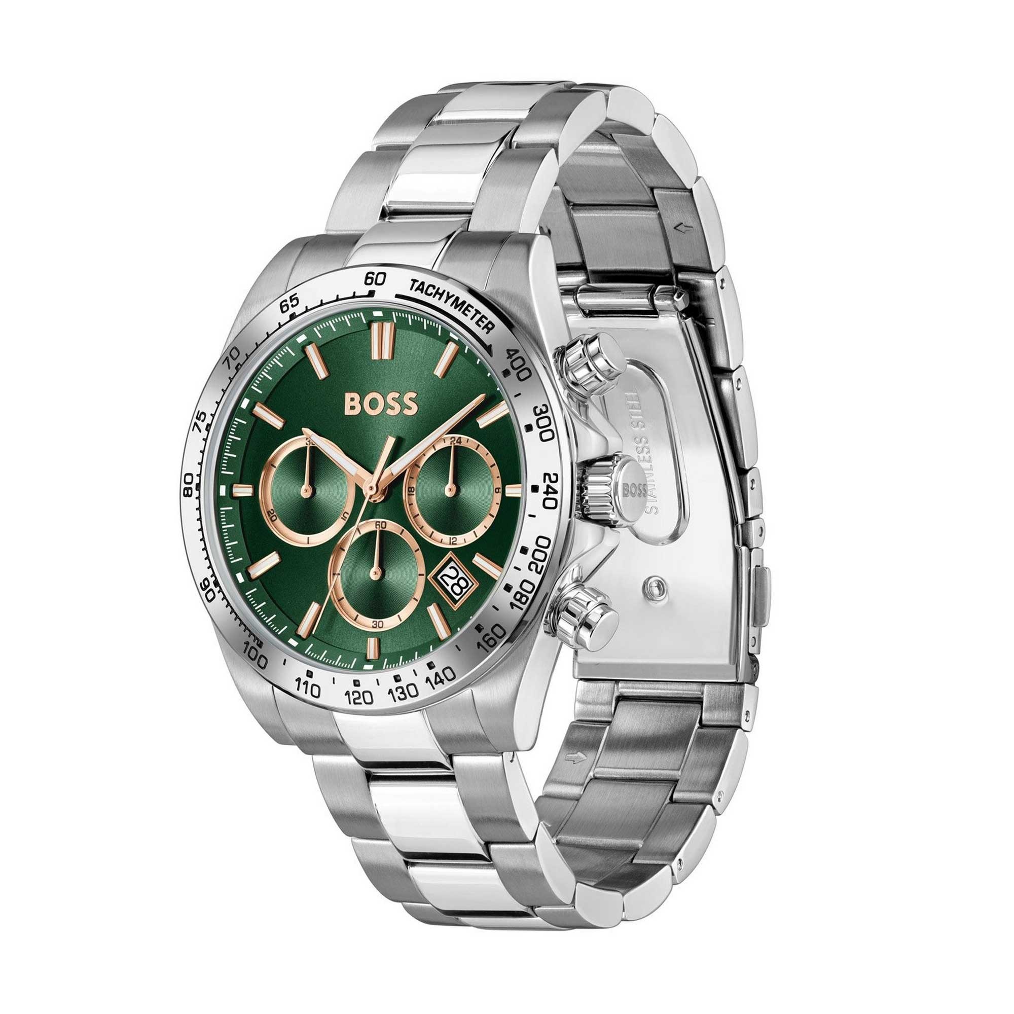 The striking green dial is complemented by baton markers, while the mineral crystal glass protects the dial from scratches. The watch offers analogue and date display, making it practical for everyday use.