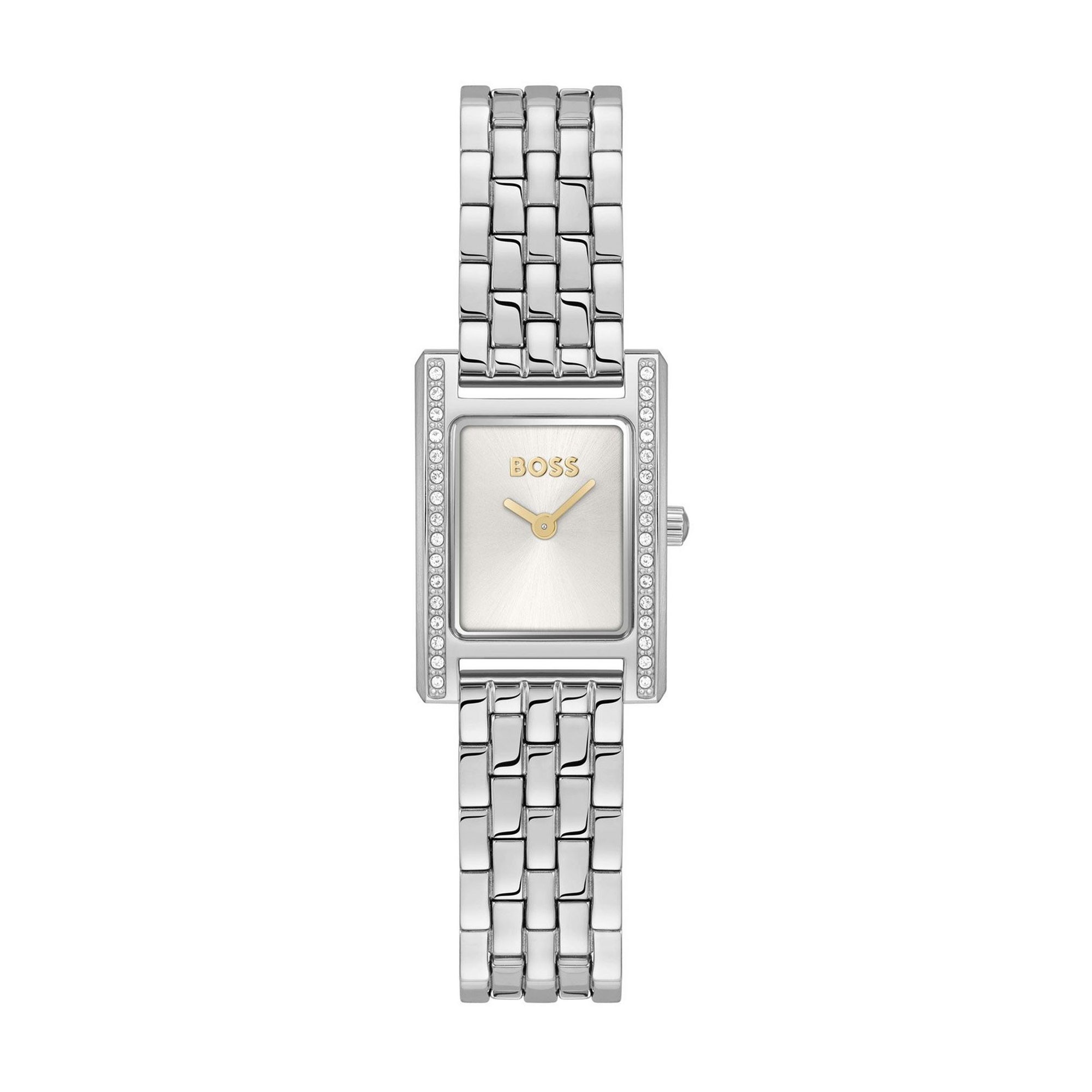 The BOSS Lucy Precious 26mm Crystal Ladies Watch 1502816 seamlessly combines elegance and functionality. This stunning piece features a quartz movement, ensuring precise timekeeping. The silver dial complements the minimalist design with no markers, presenting a sleek and refined appearance.