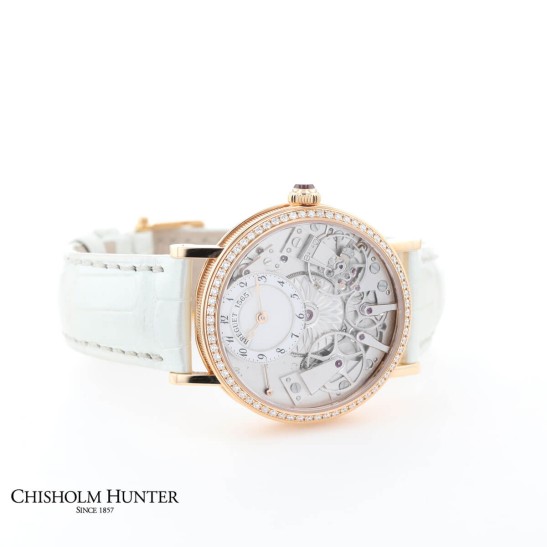 Inspired by the legendary watches by Breguet, the Tradition collection pays a vibrant and important tribute to the memory of Breguet. This collection holds the traditional brand’s origins within its timepieces while also showing a vision of the future and what’s yet to come from the brand. This 7038 Tradition watch is featured by a 18ct rose gold case that houses a diamond bezel and an open dial that showcases the movement inside the watch, allowing you to see the workings from all angles, with an off-centred dial in mother-of-pearl which is then protected by coverings of scratch-resistant sapphire crystal to give you that added security. The 37mm dial houses 68 diamonds on the bezel and is showcased on a white leather strap delicately finished with an 18ct rose gold pin and buckle fastening. Powered by a Calibre 505 SR movement, this watch gives a power reserve of 50 hours. This timepiece is water resistant to 30m. Each Breguet timepiece is accompanied by branded packaging and a 2-year warranty.