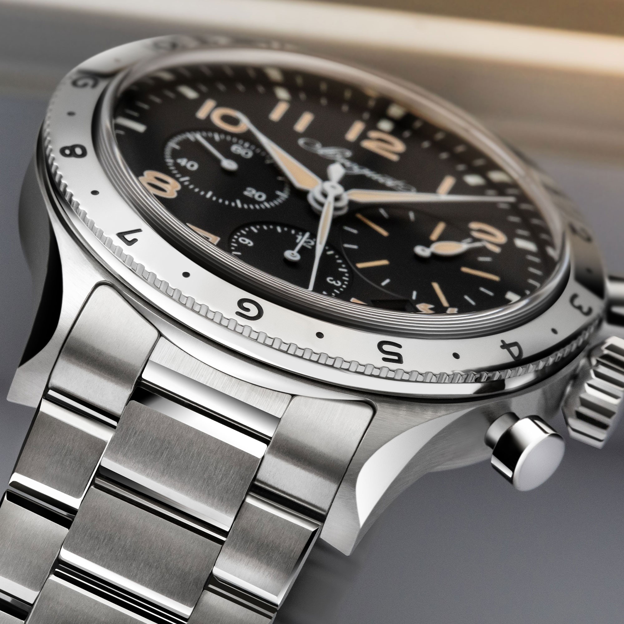 Type XX flyback chronograph in steel. Self-winding movement with date and subdial for the seconds. Balance spring in silicon. 15-minute and 12-hour counters. Bidirectional graduated rotating bezel. Luminescent hands and hour-markers. Sapphire caseback. Water-resistant to 10 bar (100m). Diameter: 42mm. Available with two interchangeable straps: one in calfskin and another in NATO fabric. A rapid interchange system allows the wearer to easily and independently switch from one strap to another.