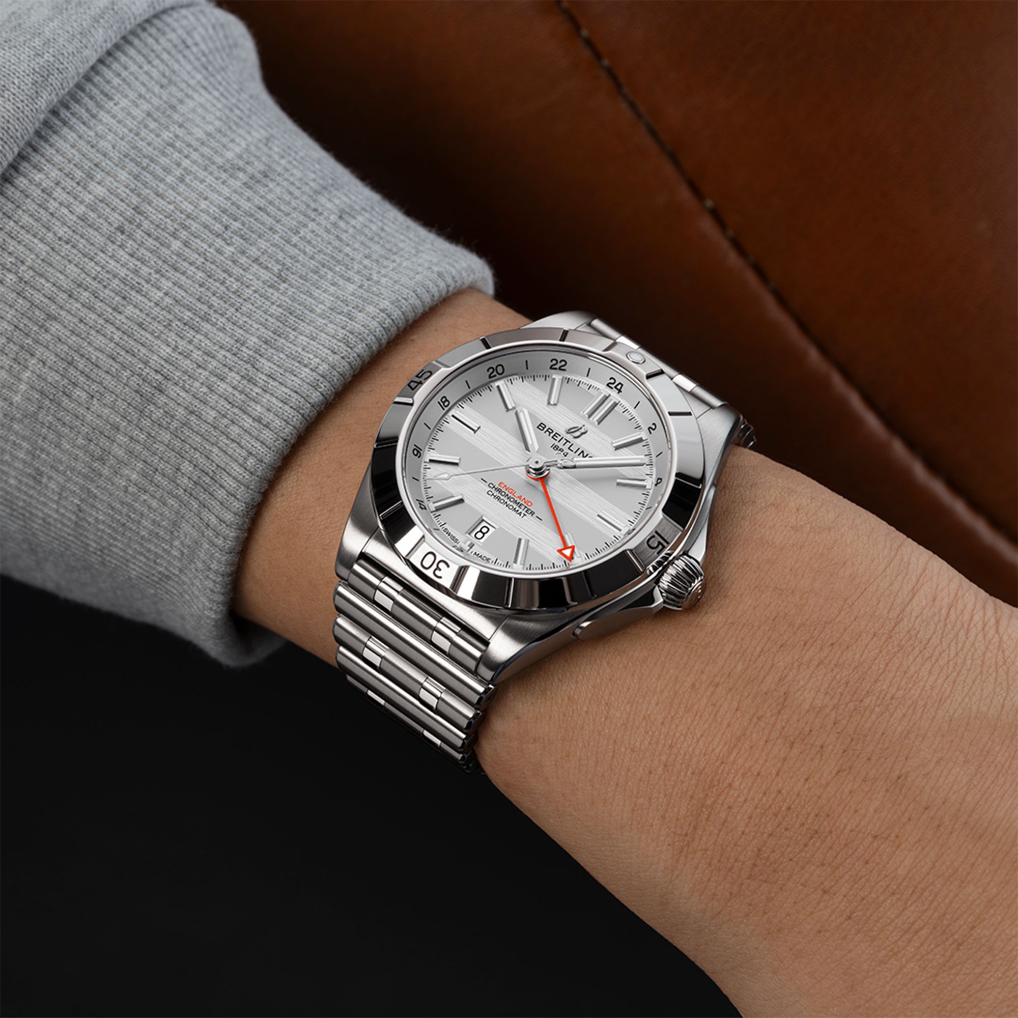 For the first time, Breitling adds an automatic GMT model, enabling precise tracking of two timezones. The watch showcases classic Chronomat features, including raised rider tabs at 15-minute intervals, an easy-grip onion crown, and a robust rouleaux bracelet. The striking white dial, marked with baton indices, reflects a blend of matte and horizontally brushed textures, echoing the stripes found on a rugby field.