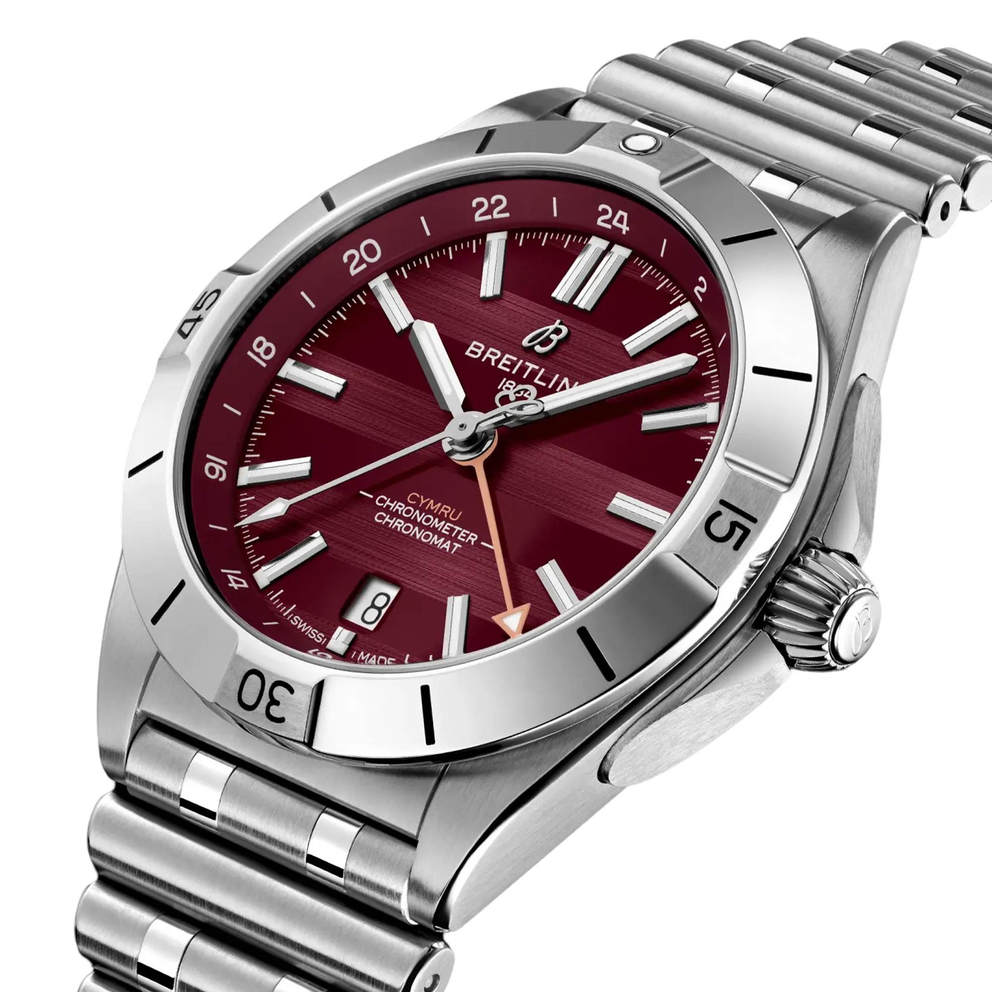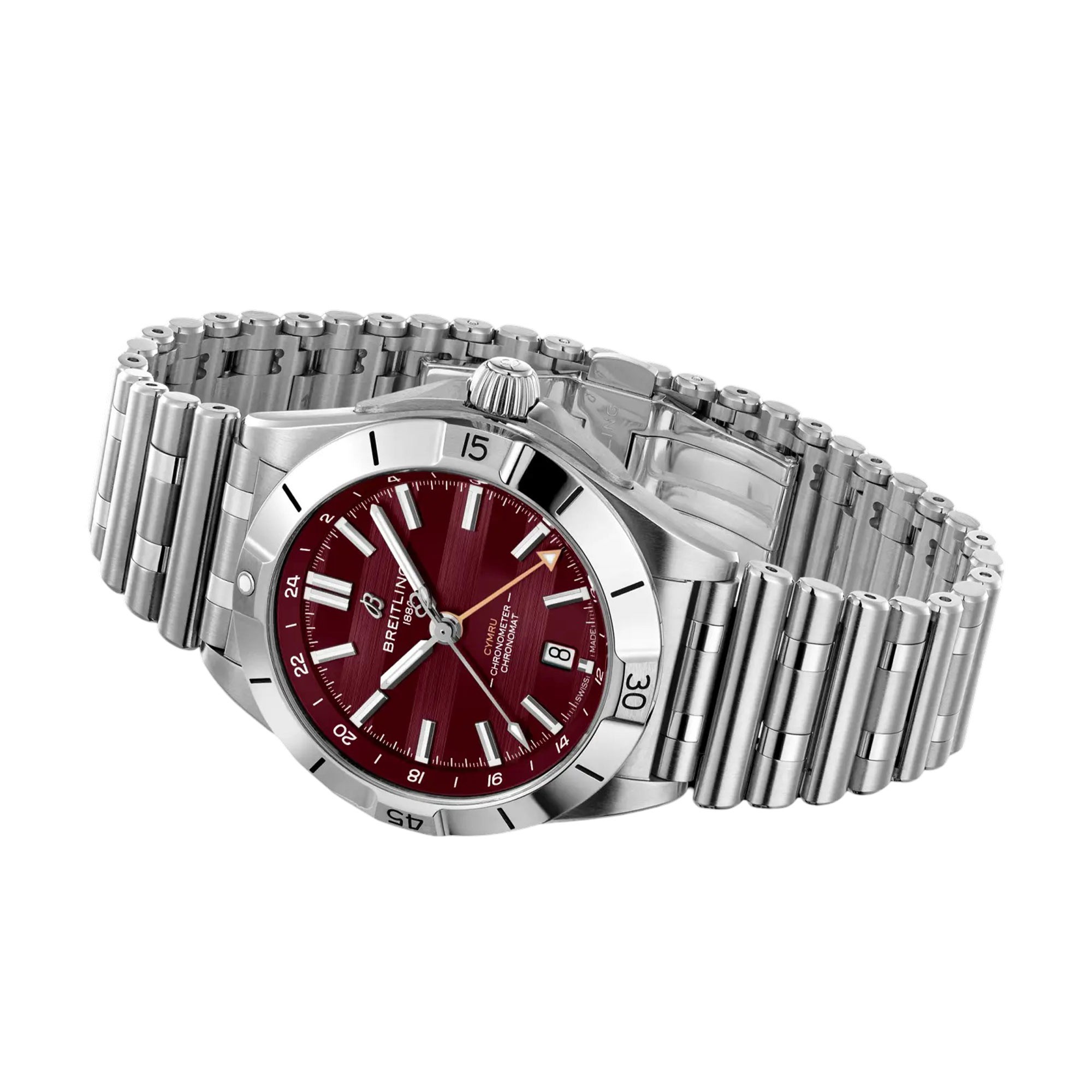 Introducing the Breitling Chronomat GMT 40mm 6 Nations Wales Automatic Watch A323988B1K1A1, a remarkable addition to the exclusive Six Nations limited-edition series. This watch celebrates the identity of Wales within the prestigious Six Nations Rugby framework. With a striking red dial, textured with alternating matte and brushed finishes, it reflects the spirit of rugby.