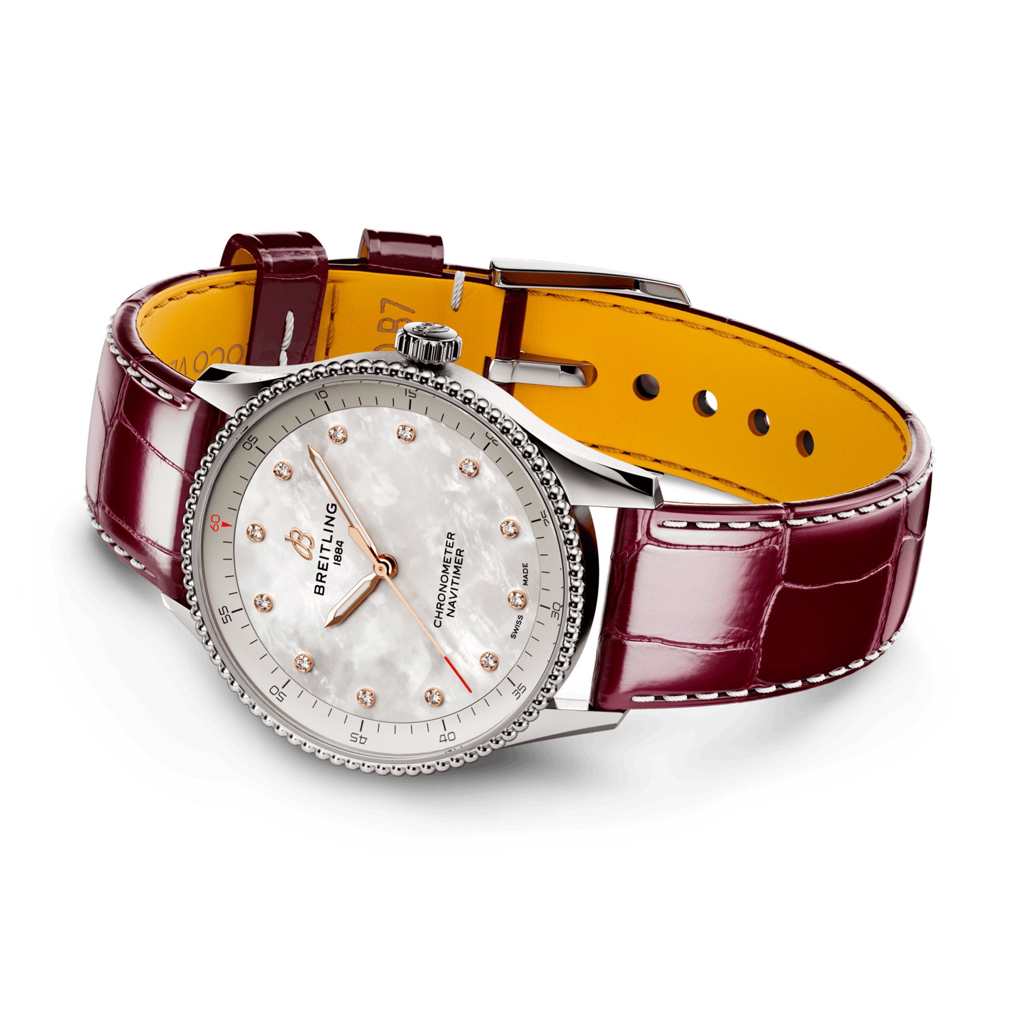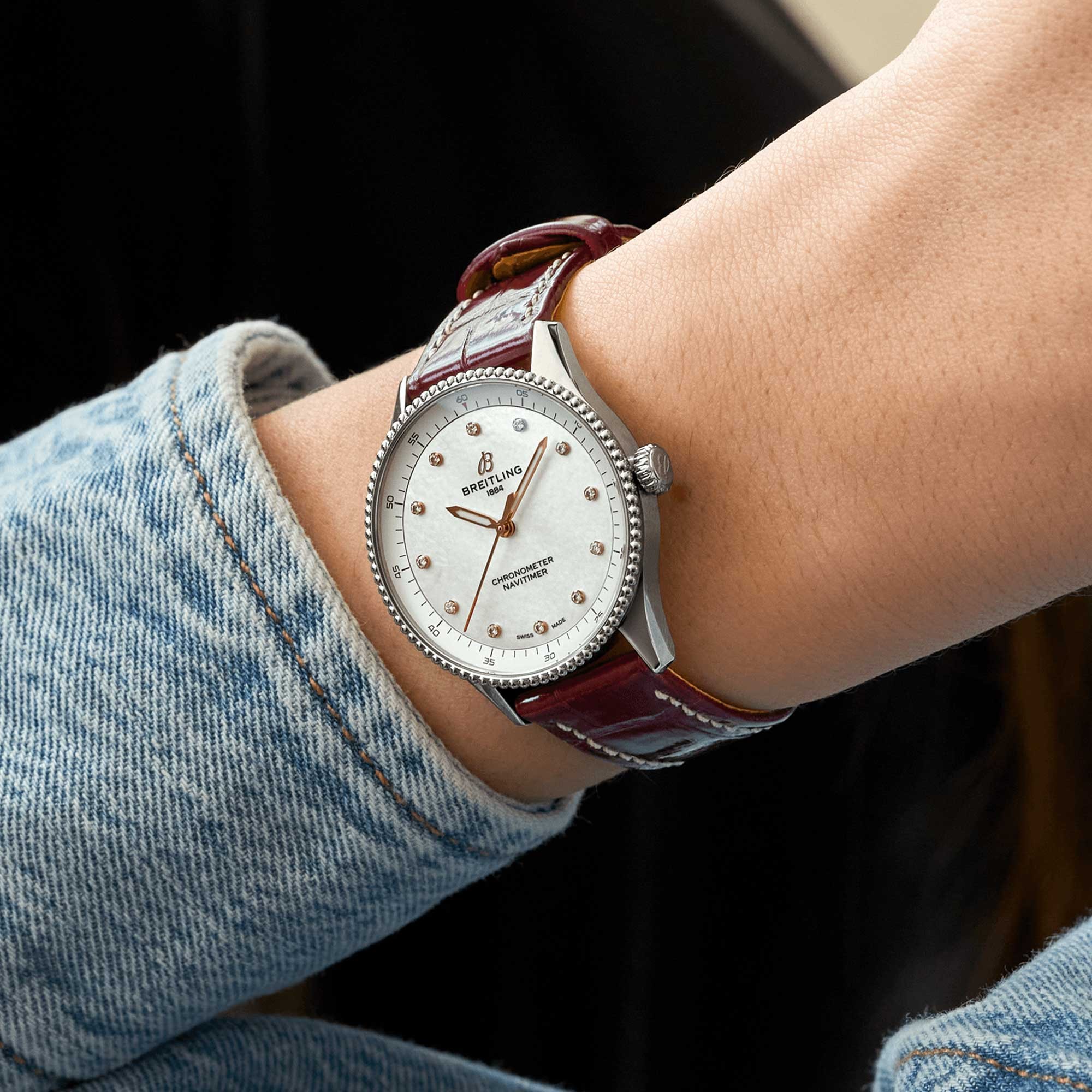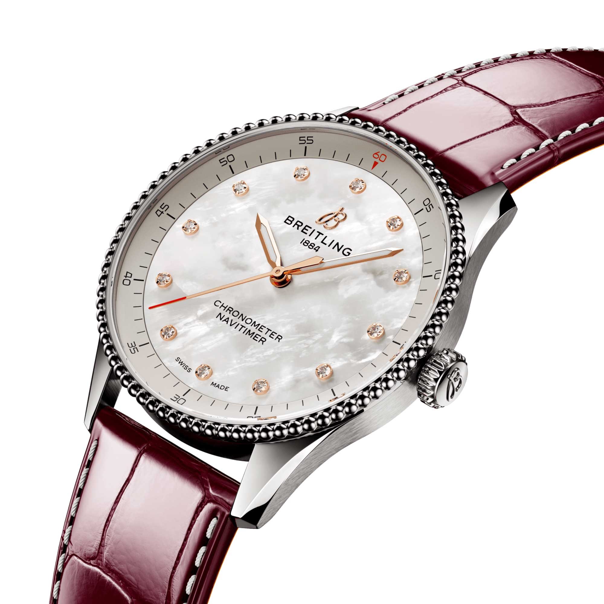 Designed specifically for ladies, the Breitling Navitimer collection combines functionality with elegance. Its white mother-of-pearl face adds a touch of femininity, while the round shape and silver case colour exude sophistication and class.
