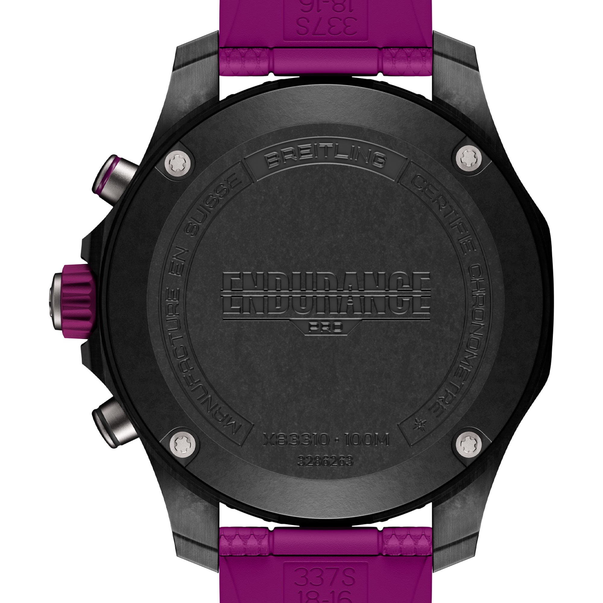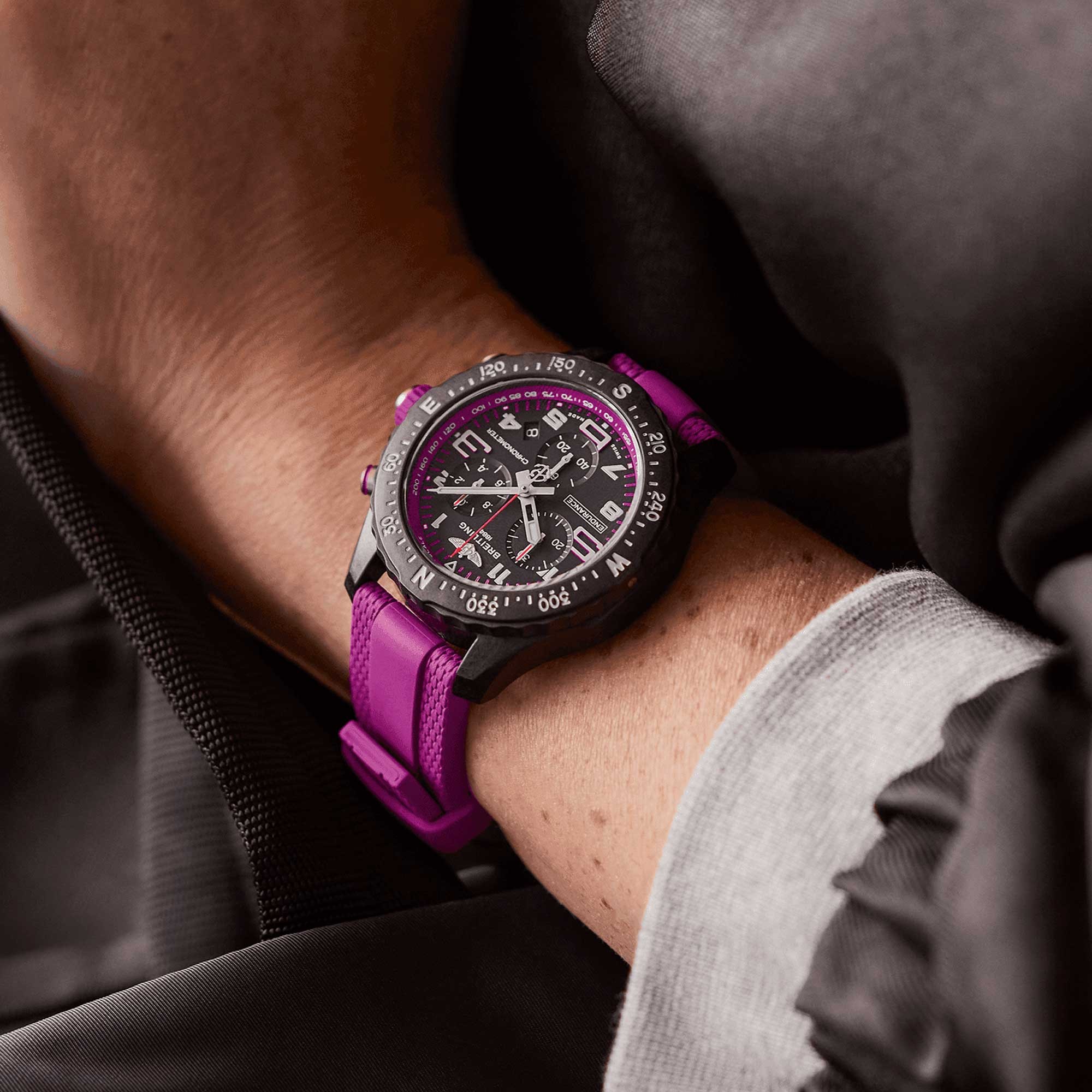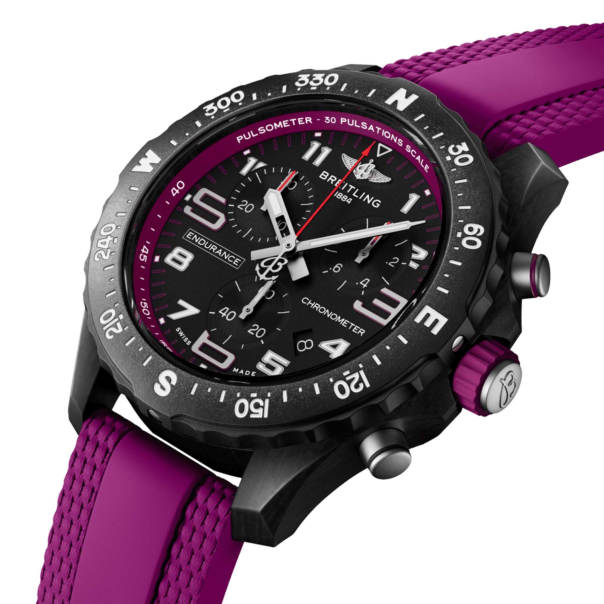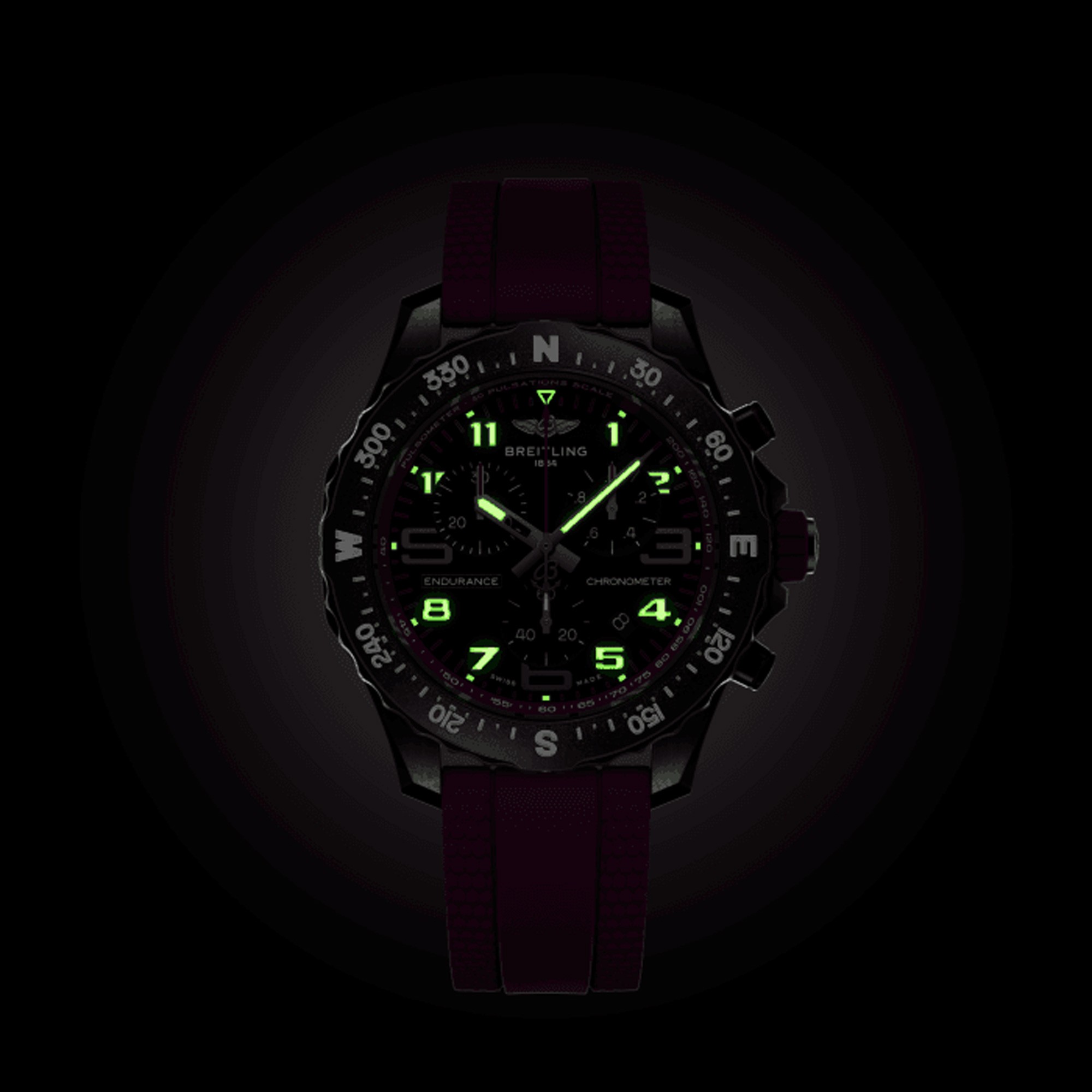 Designed to be both a lightweight timepiece for athletes and a casual, everyday sports chronograph, the Endurance Pro perfectly blends innovative technology with a vibrant design to produce the ultimate athleisure watch. Designed for men and women whose active lives combine a professional mindset with a sporty lifestyle, the Endurance Pro is up to the challenges of a rigorous workout, but fashionable enough for everyday wear. The Endurance Pro features an ultra-light Breitlight® case, a robust material 3.3 times lighter than titanium and 5.8 times lighter than stainless steel. Non-magnetic, thermally stable and hypoallergenic, Breitlight® is highly resistant to scratches, traction and corrosion. It also has a feel that is warmer than metal and a slightly textured effect, accentuating the originality of the design. Exclusive to Breitling, the material is 100-percent Swiss-made. In 44 mm or 38 mm, the Endurance Pro is available to athletes with a multitude of colourful dials and rubber straps all fitting a Breitlight® tang-type buckle. The two sizes are respectively powered by Breitling's Caliber 82 and 83, both COSC-certified SuperQuartz™ chronographs delivering exceptional precision.