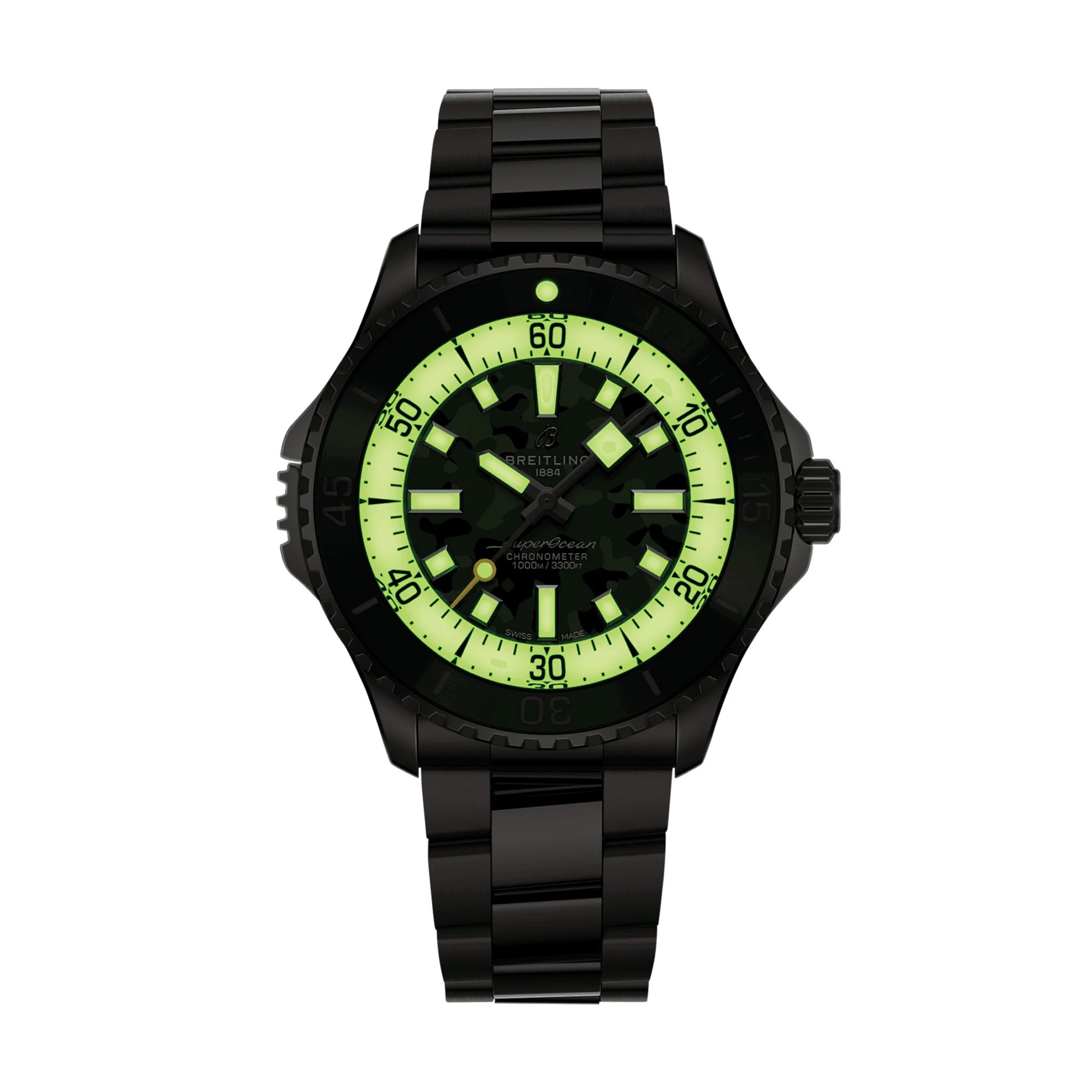 The watch dazzles with a striking green dial, setting a bold backdrop for the dots and batons that mark the passage of time. Protected by sapphire crystal glass, renowned for its scratch resistance, the dial remains pristine, ensuring that every glance at your watch is as clear as the first. The Superocean 46mm is not just a watch; it's a companion for the depths, boasting an impressive water resistance of 1000 metres, allowing you to embark on underwater adventures with unwavering confidence.