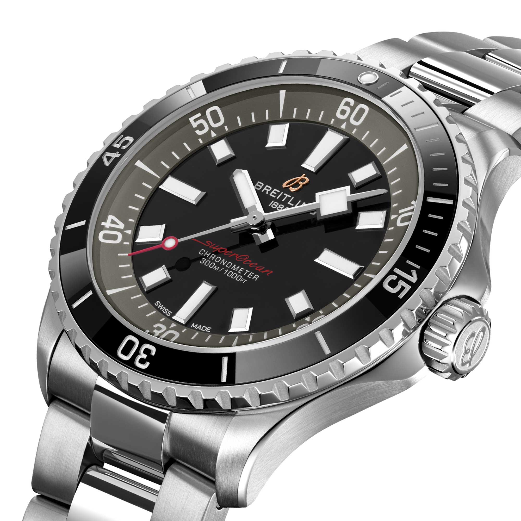 The metal bracelet adds a touch of sophistication and comfort, complemented by a folding clasp for secure wear. Housed in authentic Breitling presentation packaging, the watch makes an excellent gift for him.